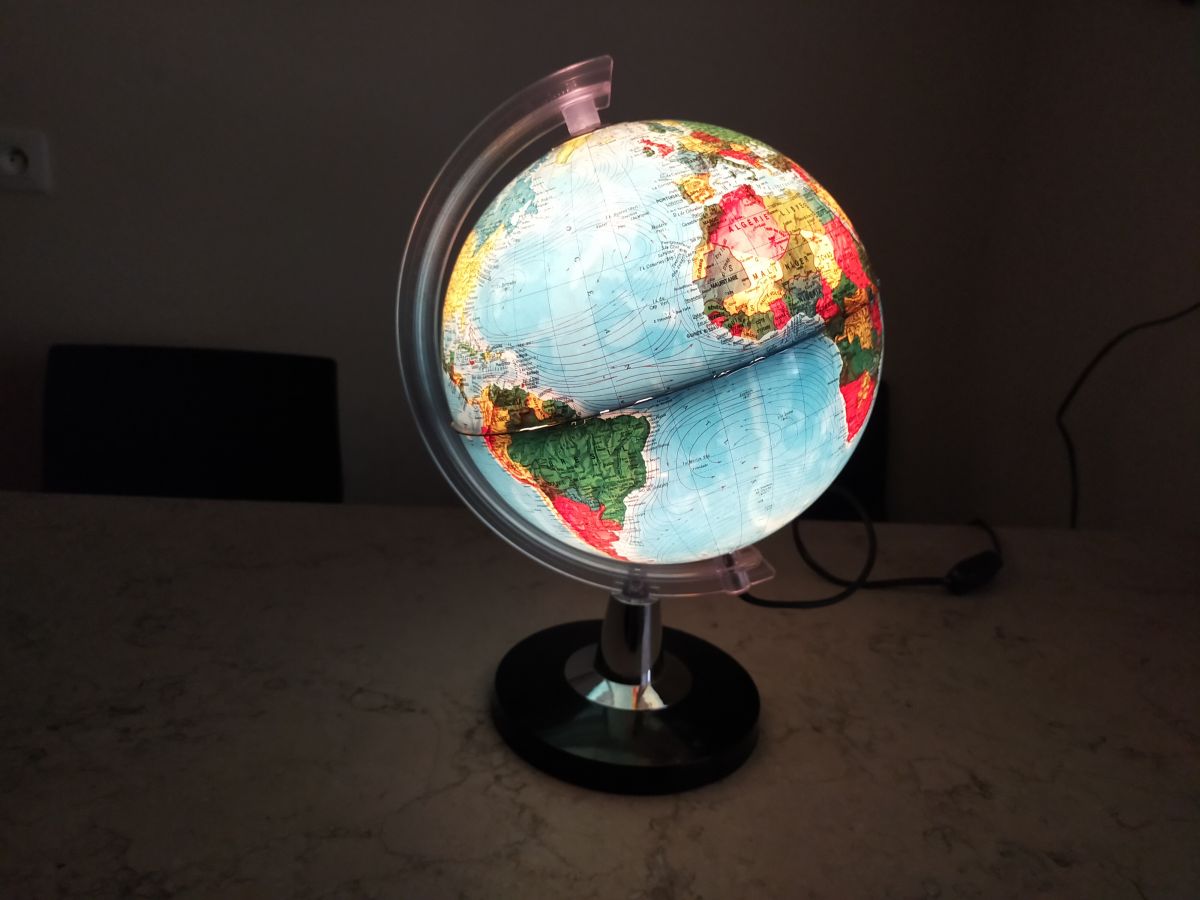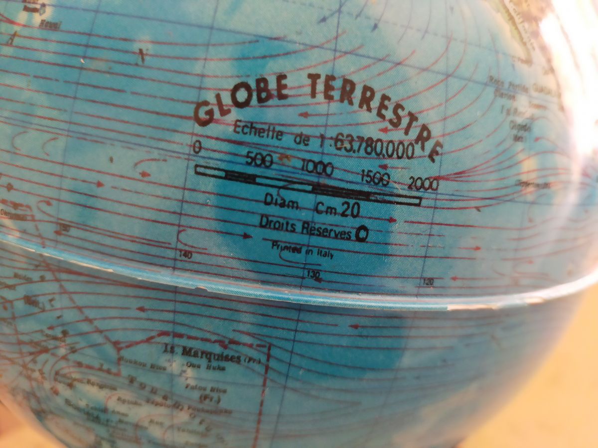 Globe terrestre/mappemonde des années 70 de marque italienne Tecnodidattica (très réputée pour sa solidité et ses cartographies précises), estampillée, globe en plastique, pied en plastique noir, hauteur 30cm, diamètre 20cm, diamètre piétement 14cm, en parfait état de fonctionnement, quelques manques sur la jointure (voir photos) absolument sans conséquence, bon état.