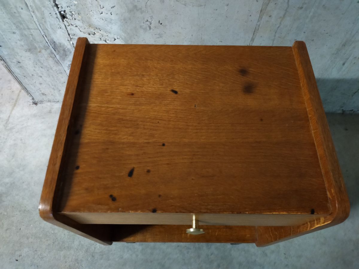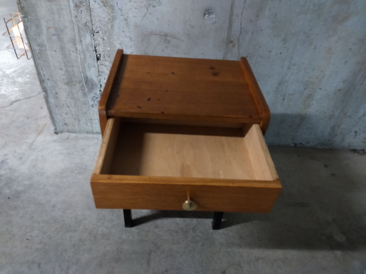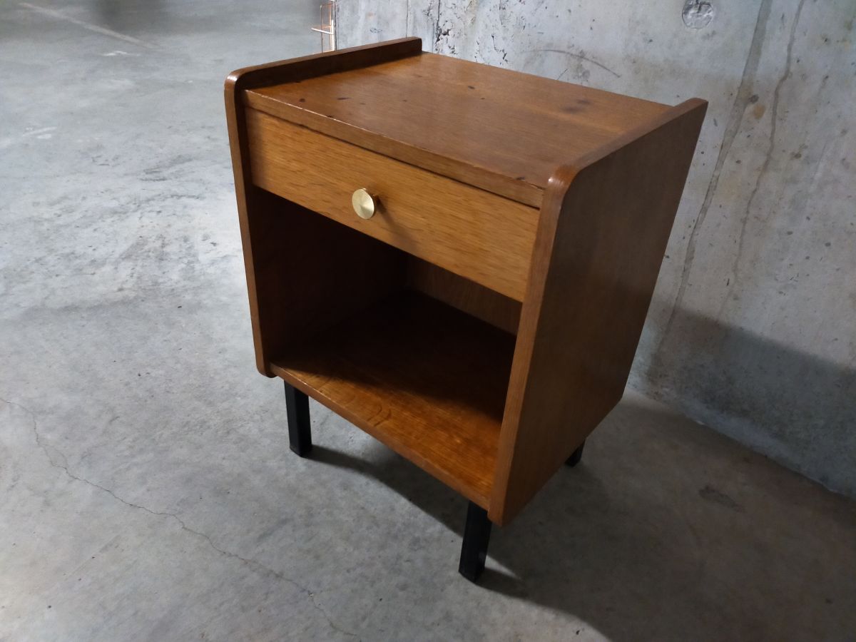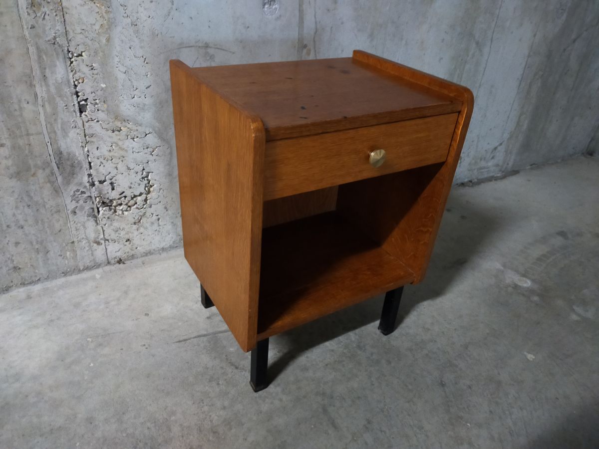 Chevet des années 50 en chêne clair et placage vernis, dans l’esprit de Pierre Guariche, pieds en métal noir, 1 tiroir, quelques traces d’usage normal, peut s’utiliser comme meuble d’appoint dans un salon, dimensions (cm) : L.42xH.56xP.31, bon état général.