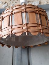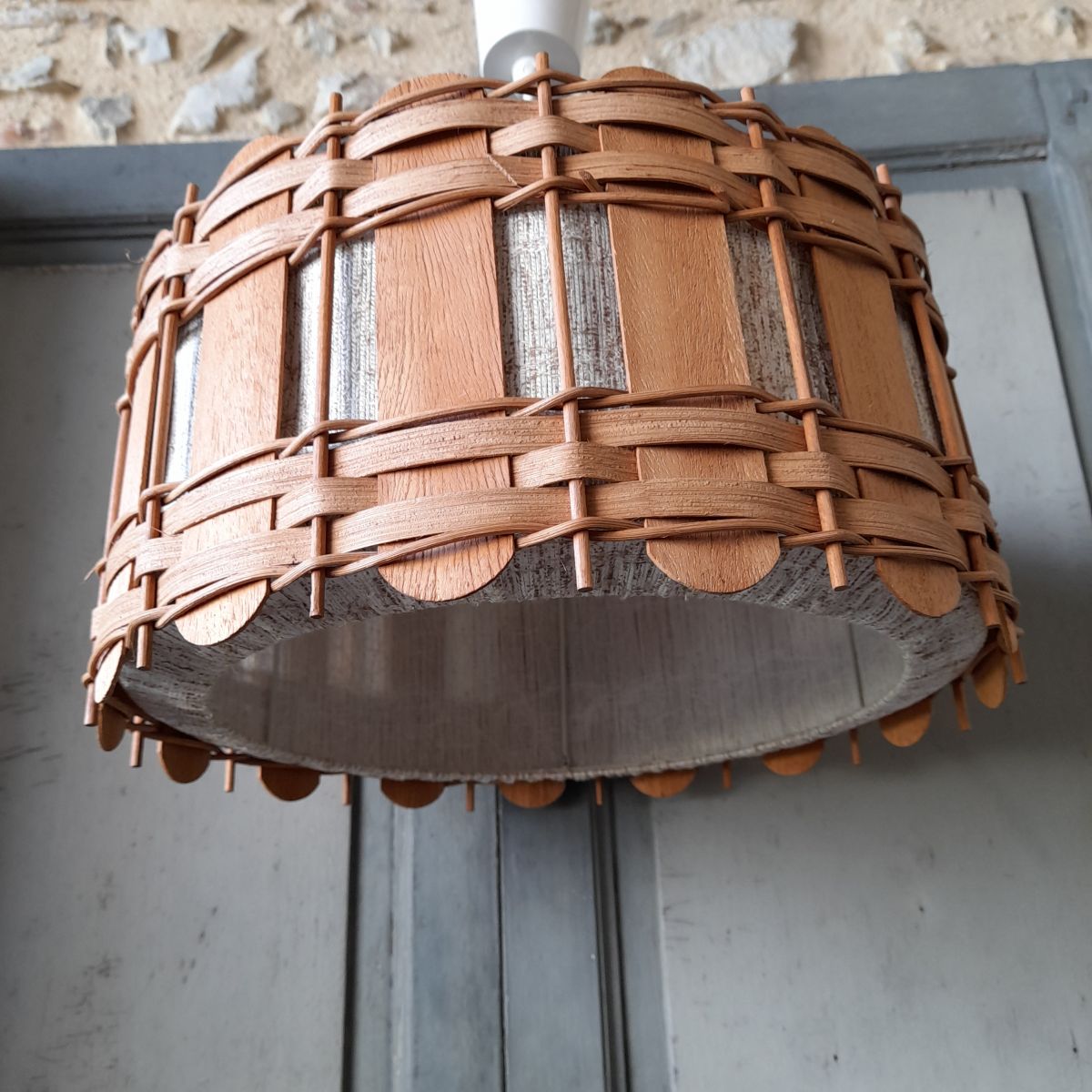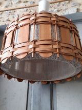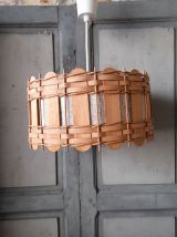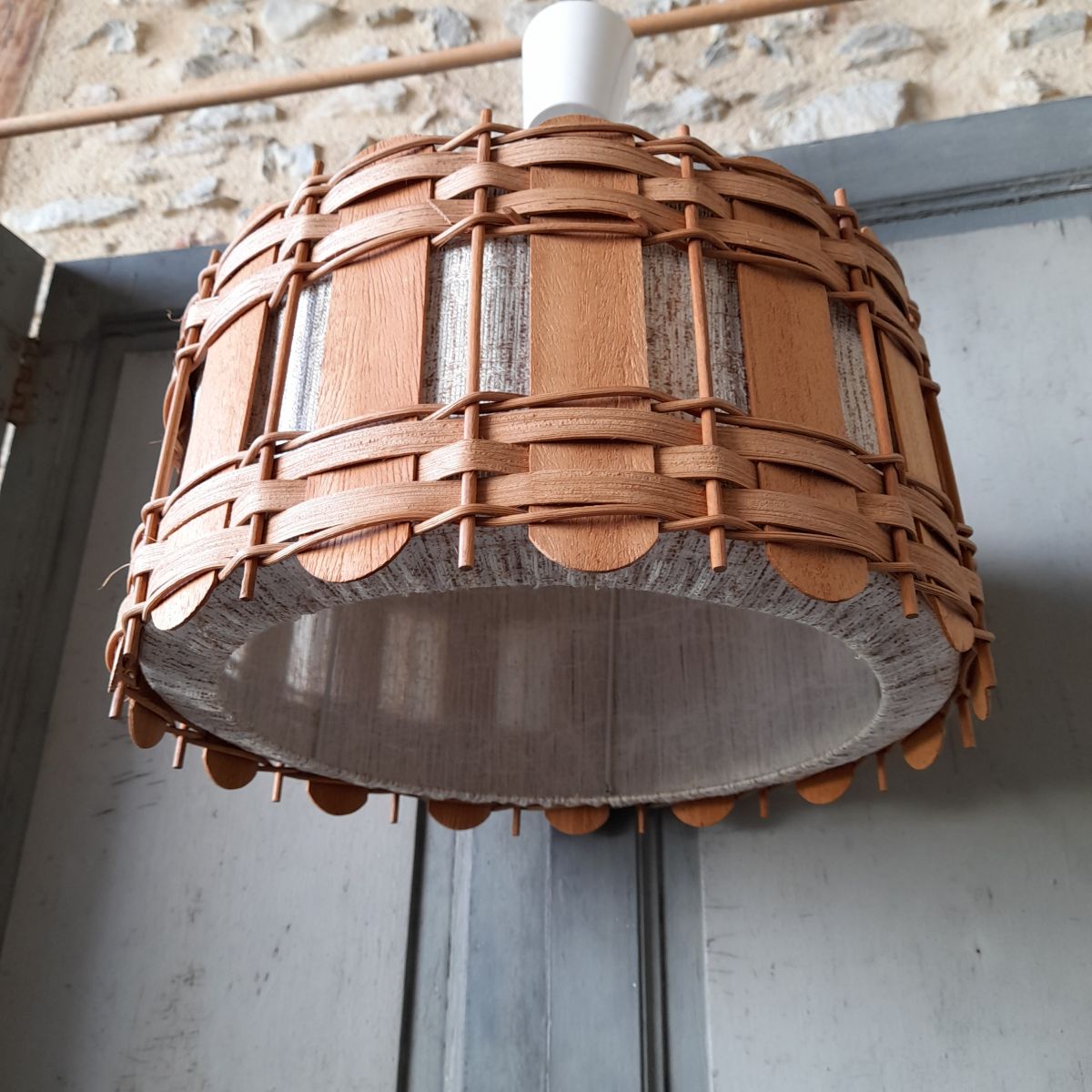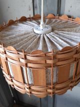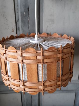 Années 60-70 suspension en bois et tissus dans le style scandinave. Propre et bon état. Diamètre 33 cm hauteur 18cm.