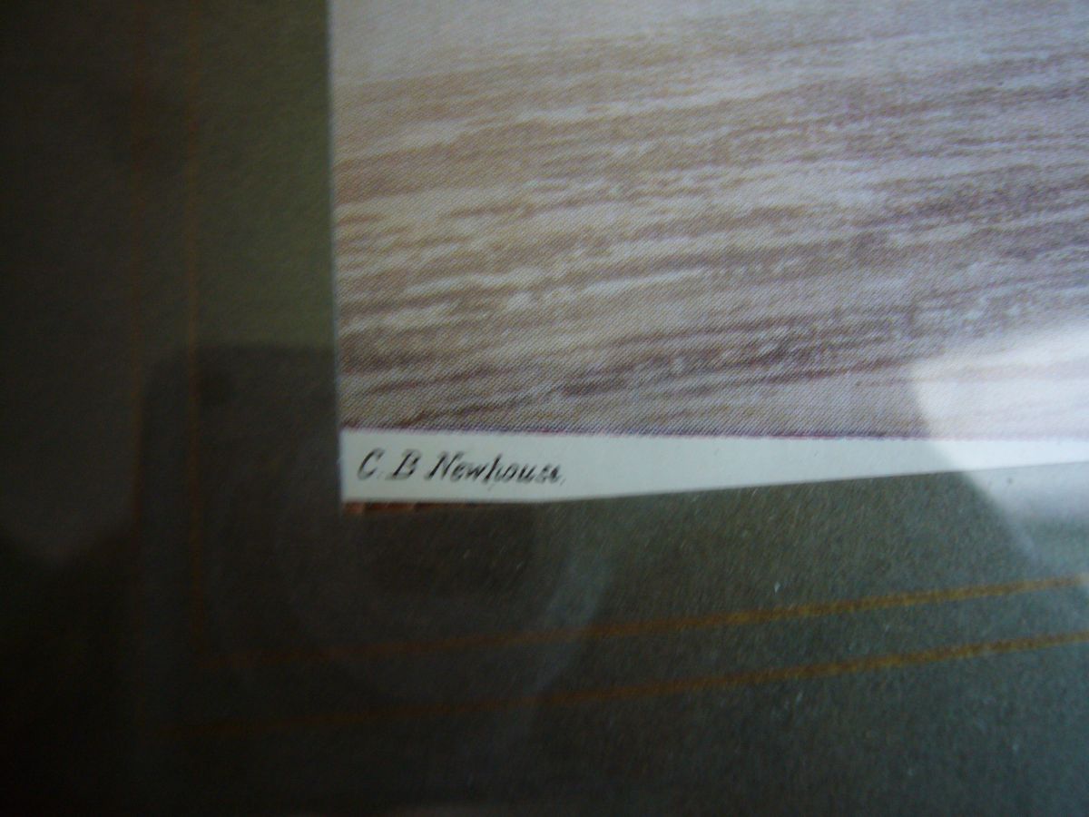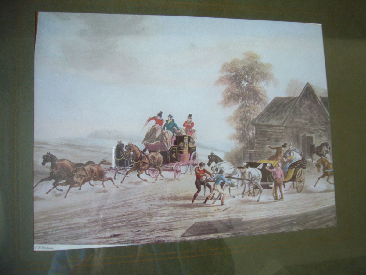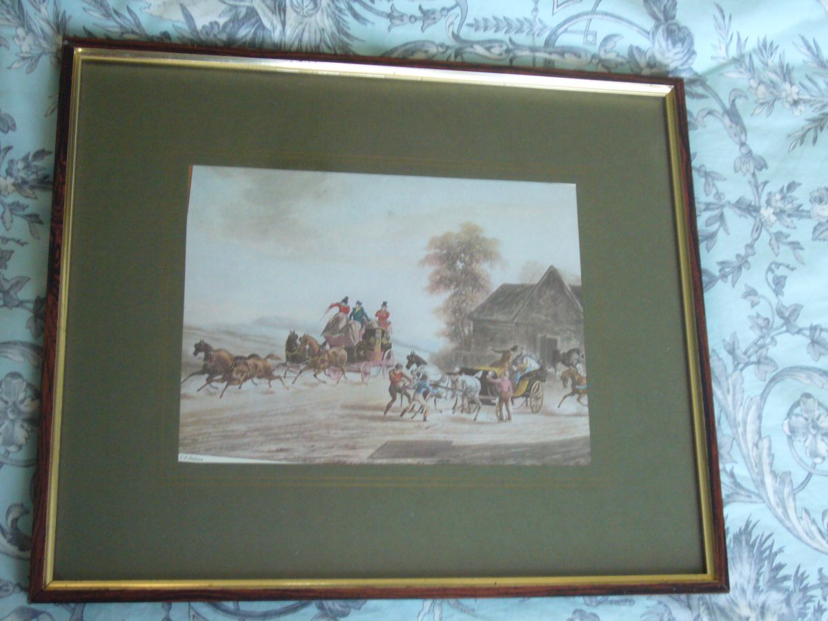 Gravure anglaise ancienne signée, cadre bois doré, couleur vert olive