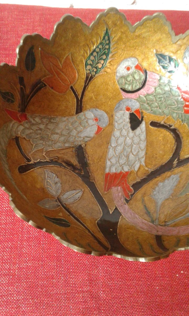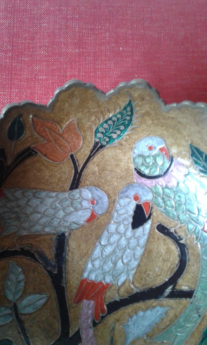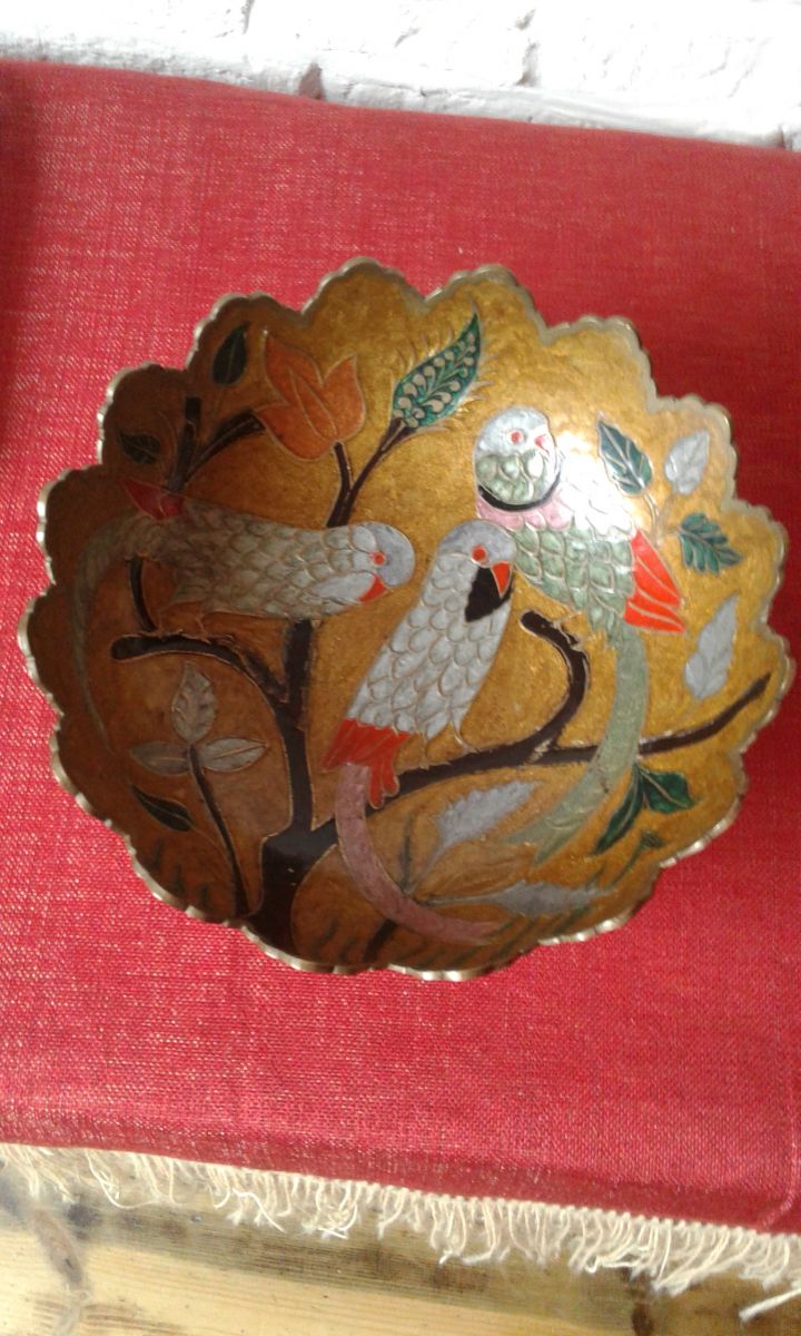 Coupes en cuivre ou laiton décor perruches tendance actuelle, a noté quelques manque email sur branche noir voir photos.