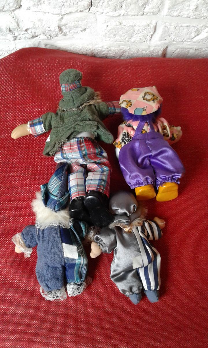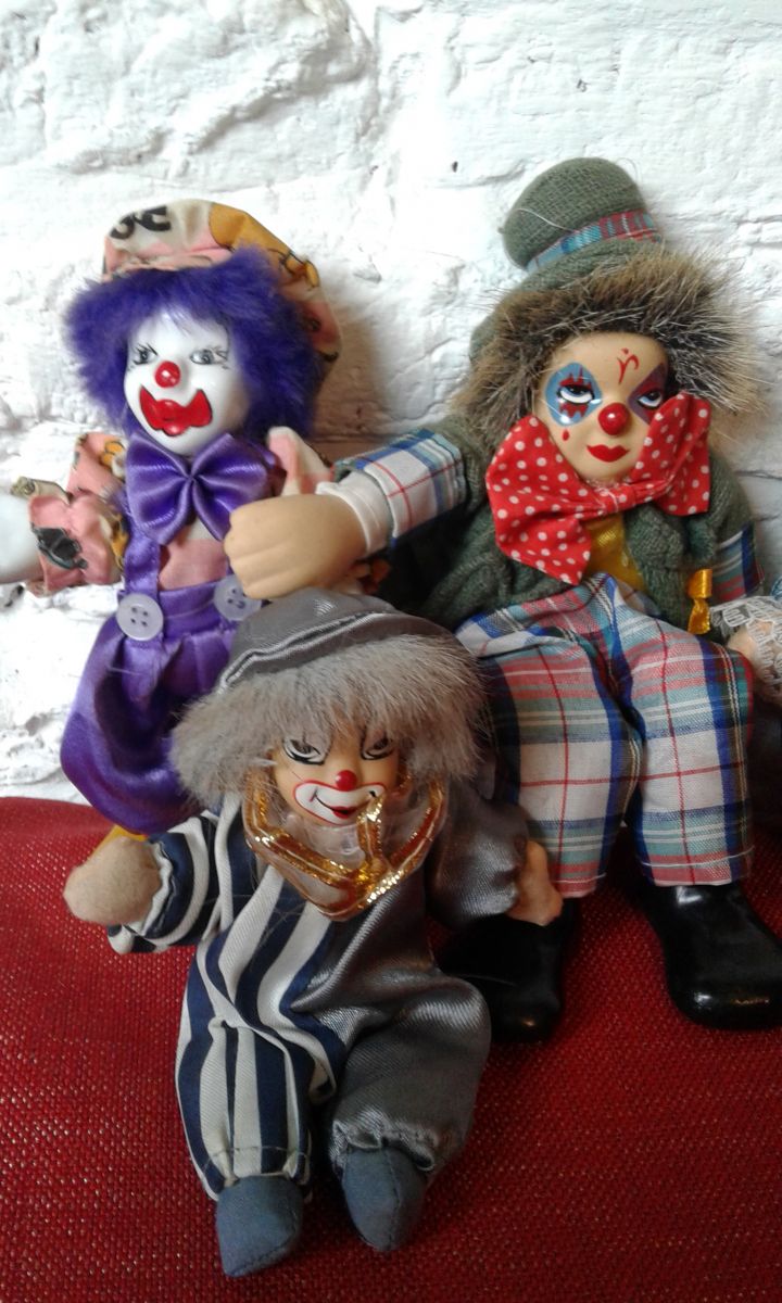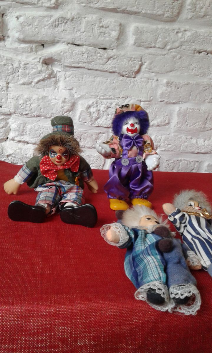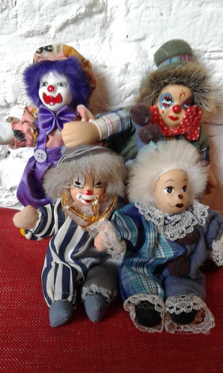 Ensemble de clown année 80 matières tissus et porcelaine hauteur pour le clown nœud papillon rouge 24 cm de hauteur pour les 3 autres 12 cm de h.