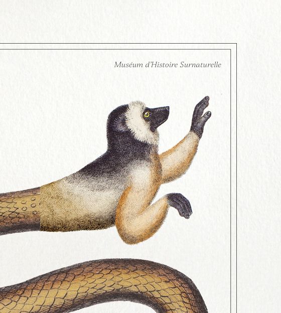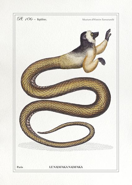 Chimère composée avec 2 anciennes gravures datant de 1850. C’est une manière étonnante et ludique de redécouvrir ces superbes gravures d'époque. Ici, le najafaka najafaka. Pour amateur-rice-s d'illustration hors des sentiers battus ! Le format a5 avec une seule chimère est idéal pour composer un ensemble dynamique de plusieurs cadres. Tirage d'art réalisé en impression pigmentaire de très haute qualité sur papier 300gr. Le résultat est magnifique, d’une grande précision, un rendu identique à une sérigraphie ou l’offset, mat et velouté (c’est la qualité des tirages de galeries d’art). Le tirage sera discrètement signé en bas à droite. Tirage vendu seul sans le cadre (possibilité de l’obtenir encadré). D’autres chimères et formats disponibles. Format a5 = 15 X 21 cm.