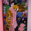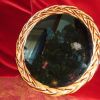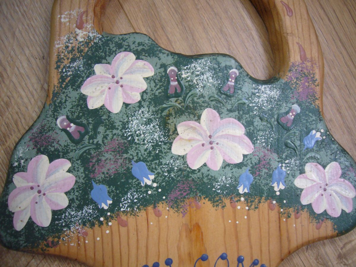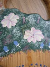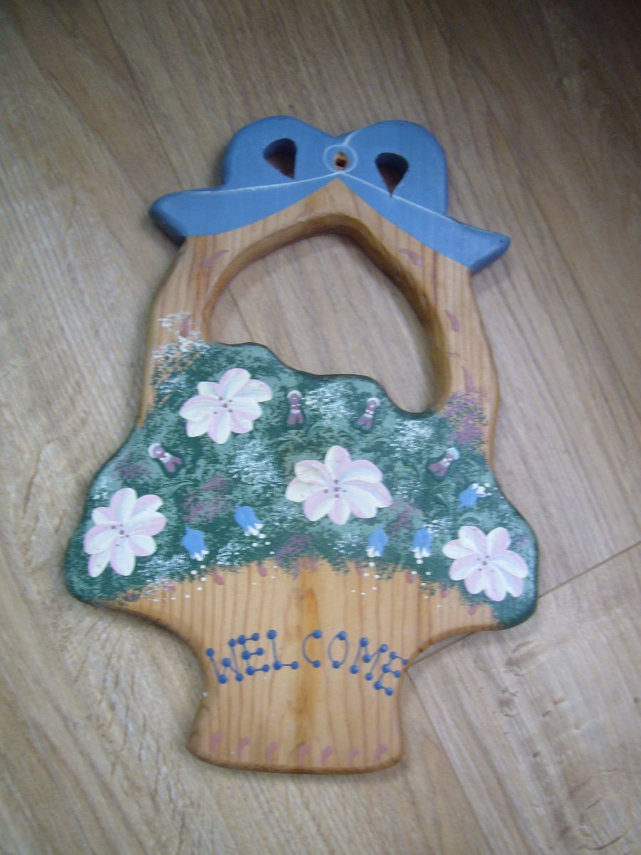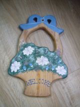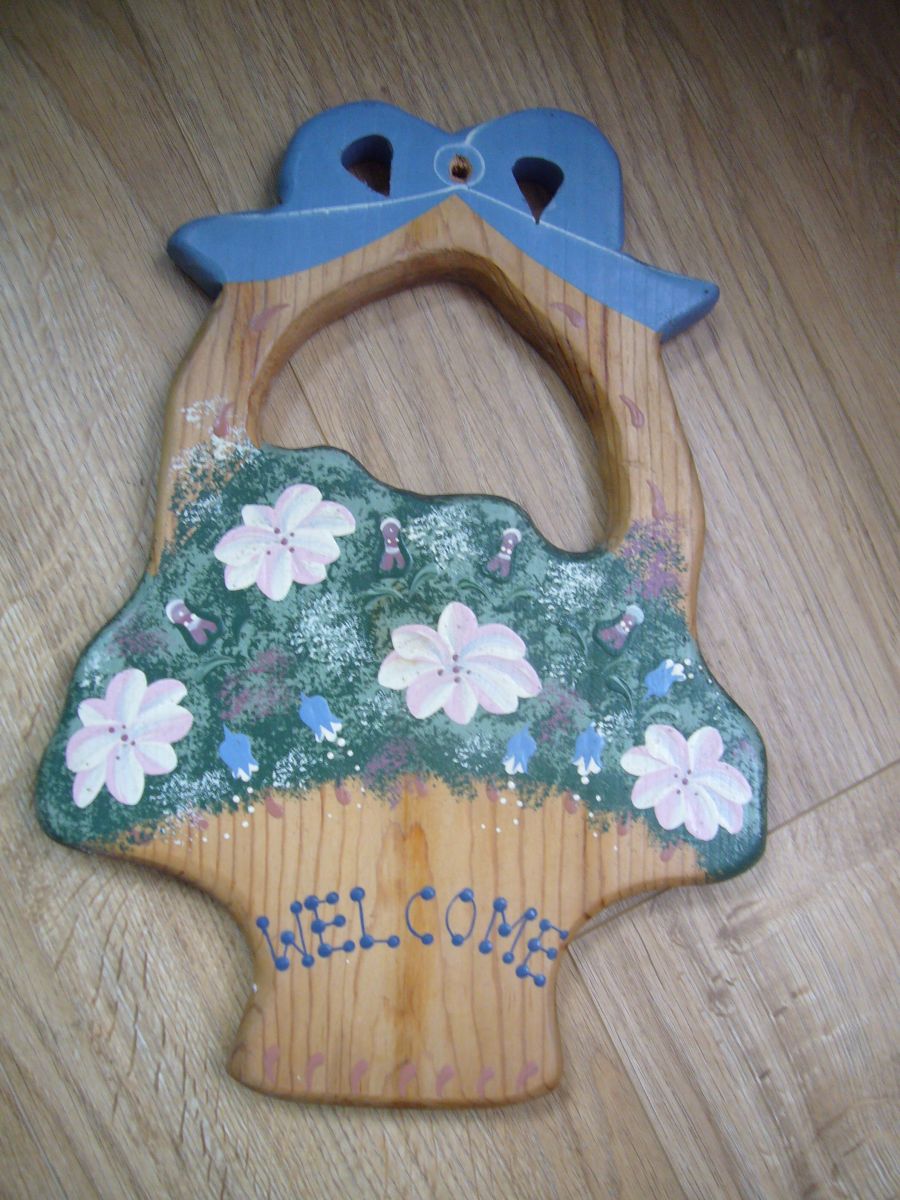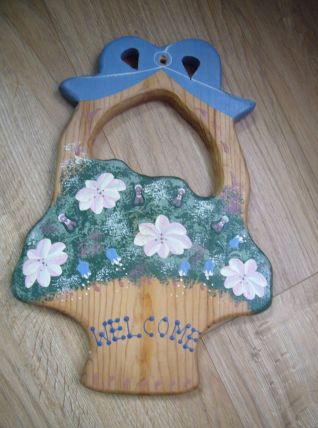 Plaque décorative en bois en forme de panier à fleurs, artisanat du Mexique, inscription "Welcome" en bas, couleurs bleu-vert