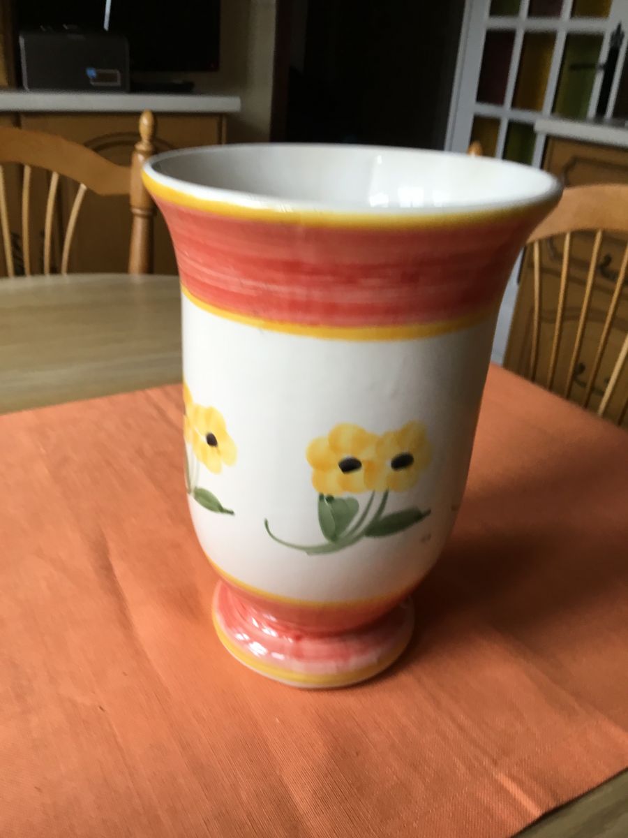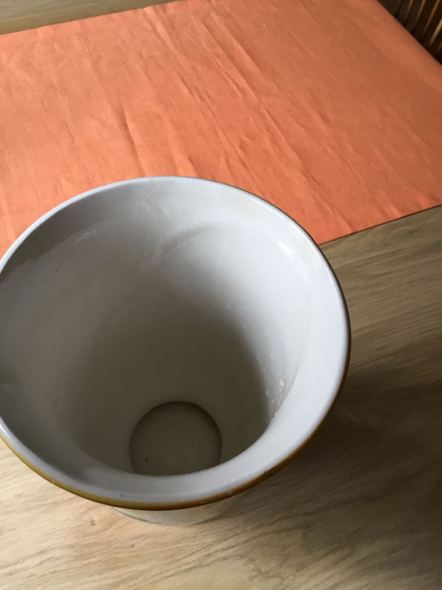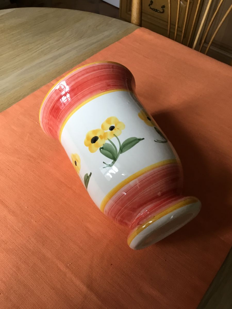 Grand vase floral en faïence à décor fond blanc et orange avec décor de fleurs jaunes pour grandes fleurs type glaïeuls , marguerite, branches de lilas. Dimension haut 24cm diamètre du col 17 cm et delà base 11cm