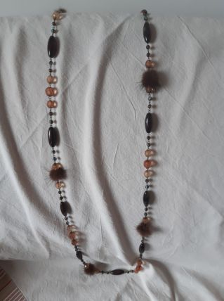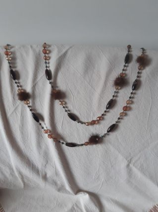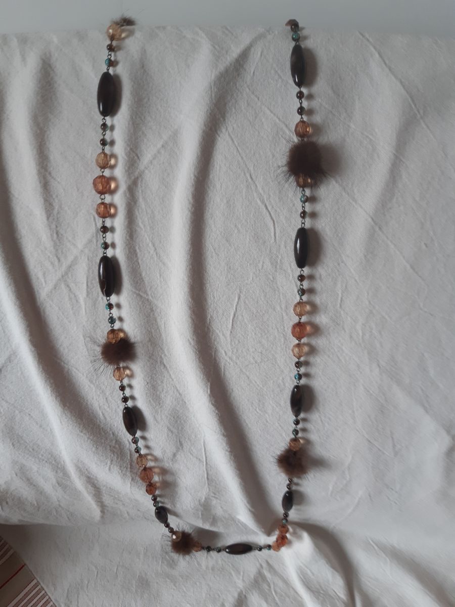 Sautoir ou collier perles et petites boules de fourrure ( vison je pense ), très bon état