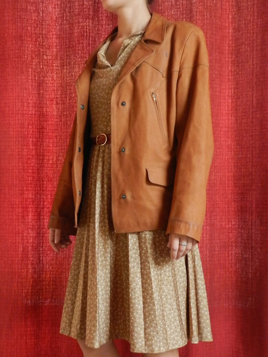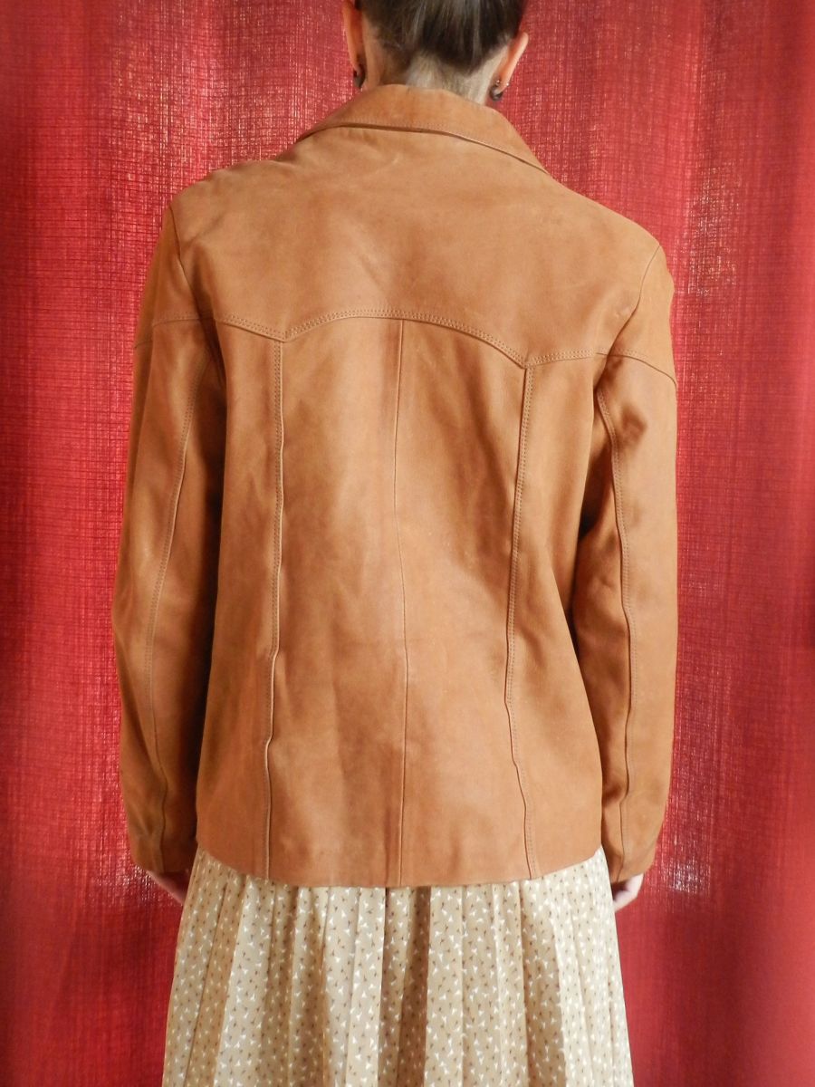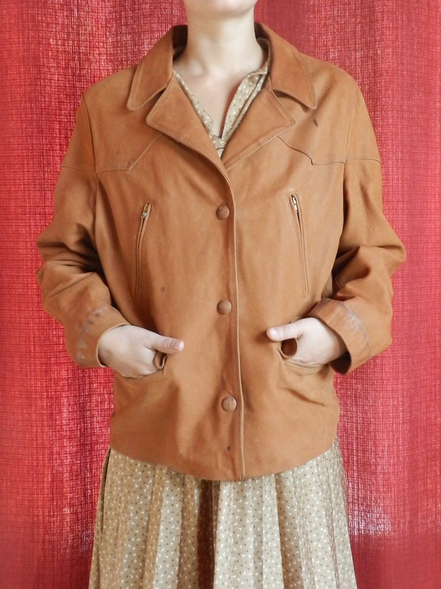 Quelques petites taches sur le devant pas très voyantes elles se fondent dans la matière, le bas des manches est légèrement patiné.