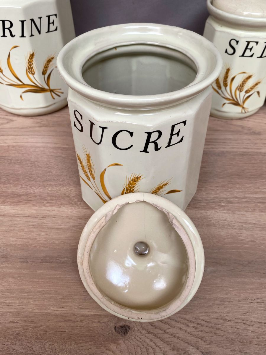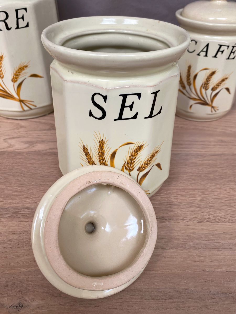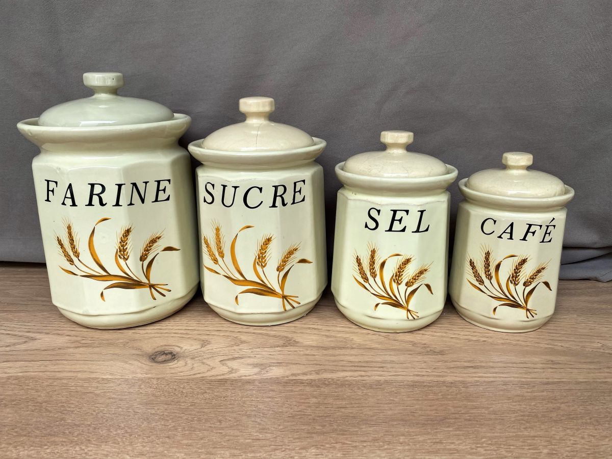 Série de 4 pots à épices en céramique, "Café", bel état, traces d'usage. Diamètre 10 cm, hauteur 16 cm. "Sel", bel état, traces d'usage. Diamètre 11,5 cm, Hauteur 18,5 cm. "Sucre", Couvercle cassé avec manque en intérieur et fêlure en surface. Diamètre 13 cm, hauteur 21 cm. "Farine", bel état, traces d'usage. Diamètre 15 cm, Hauteur 23 cm.