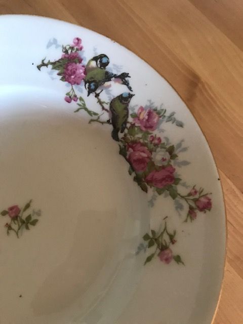 3 Assiettes creuses en porcelaine décor mésanges et roses (je ne connais pas le fabricant).