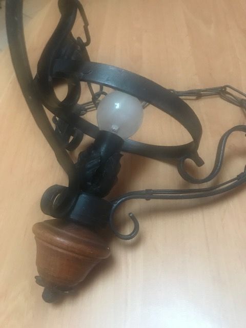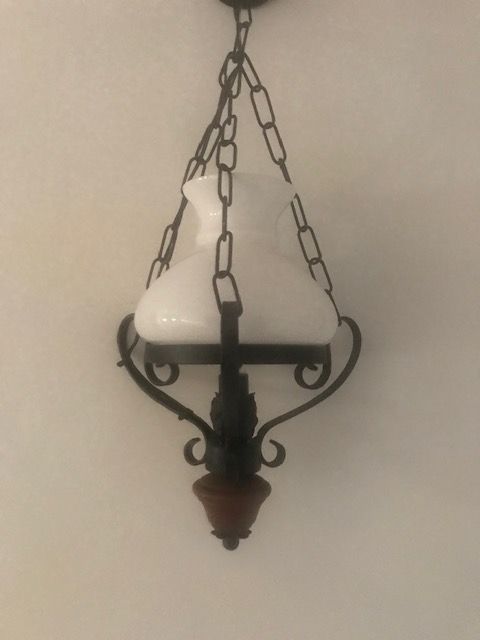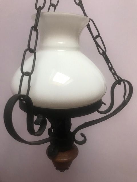Plafonnier à suspendre vintage globe opaline blanc support métal et bois.