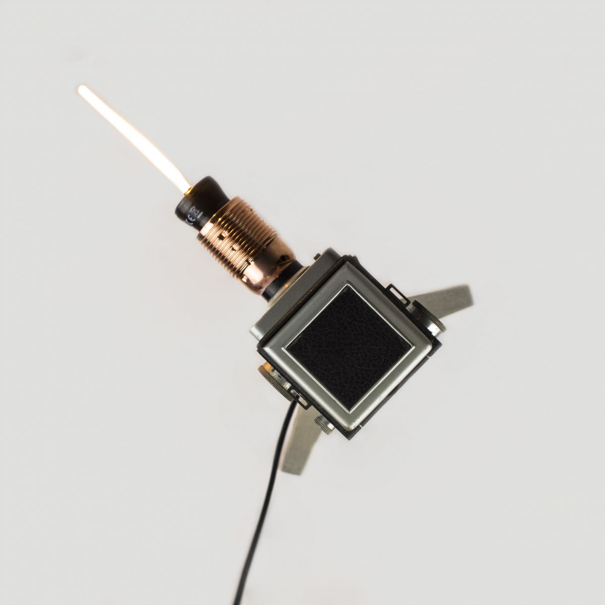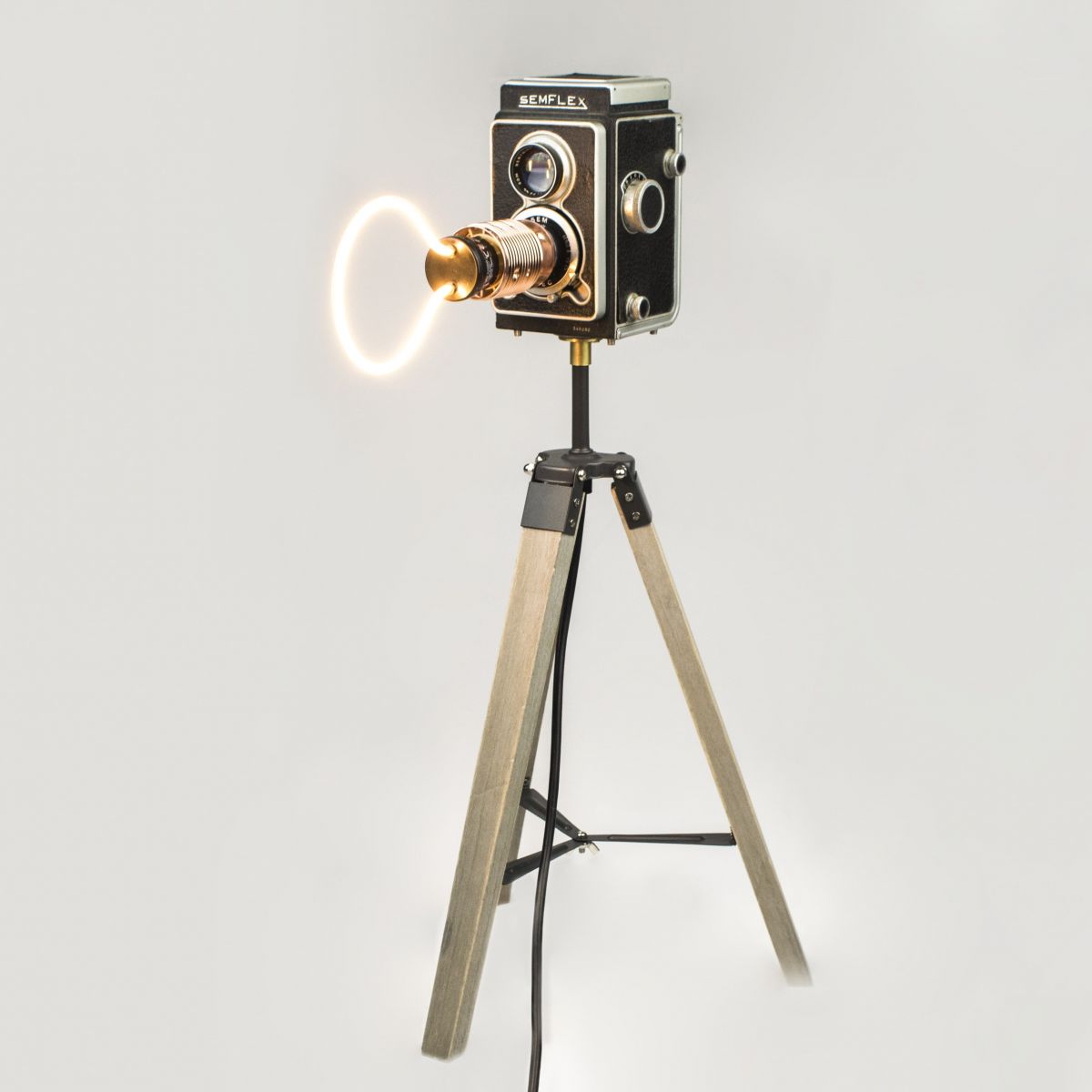 Composé d'un trépied en acier et bois, d'un bras tubulaire cintré métalliques et d'un câble d'alimentation équipé d'un interrupteur. Elle trouve sa place idéalement sur le sol un sur une table.