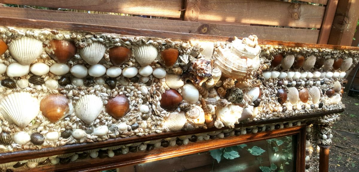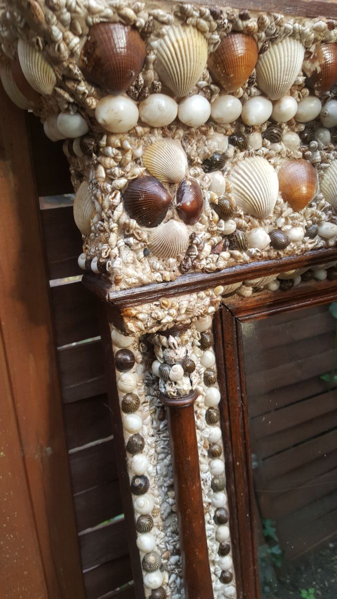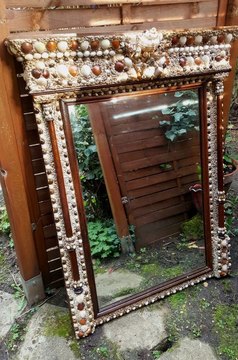Miroir ancien dessus de cheminée. Bois et coquillages sertis.