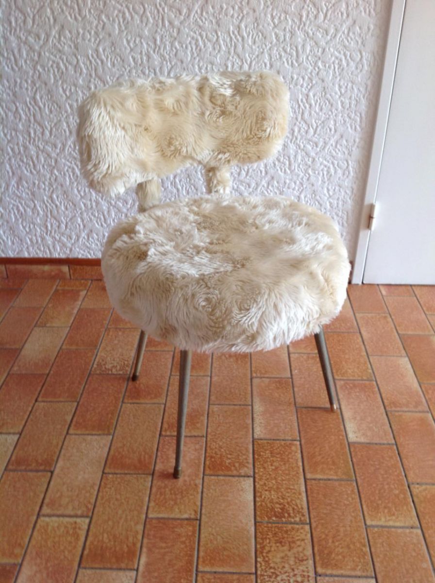 Chauffeuse Vintage Pelfran (Peluche Française) en fausse fourrure crème qui égayera votre intérieur. L'assise de la chaise est en moumoute d'origine, déhoussable et lavable. La mousse s'effrite un peu sur sur le dossier (voir photo 4)
