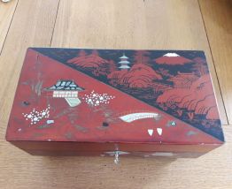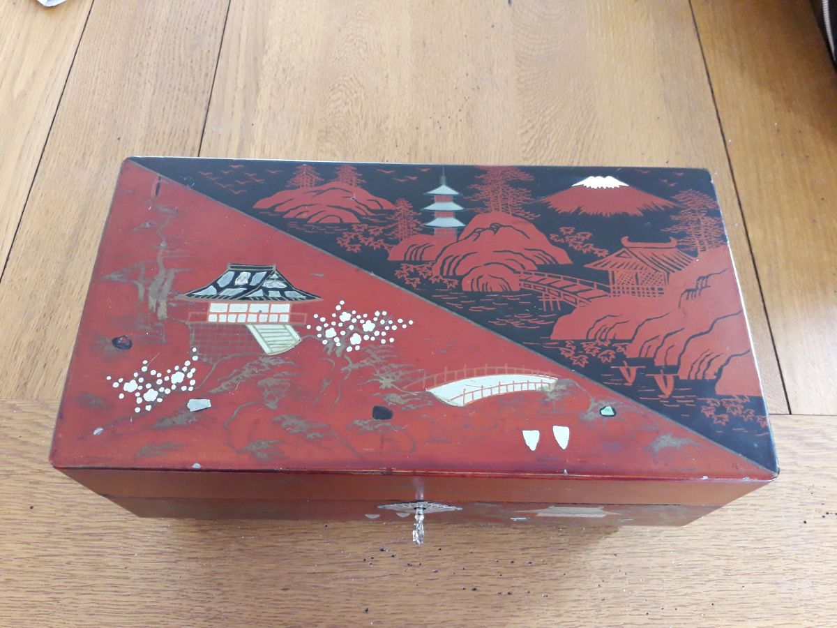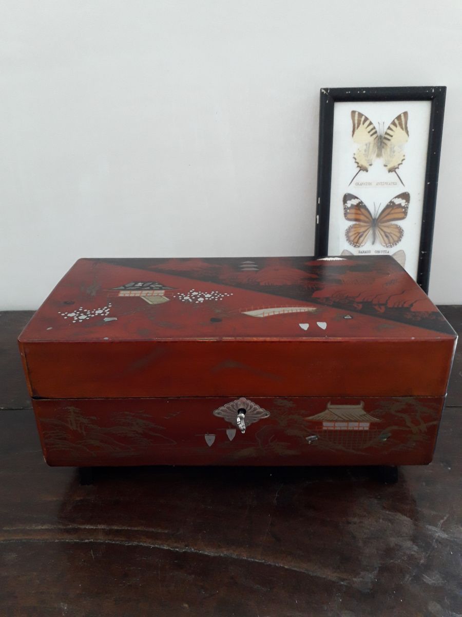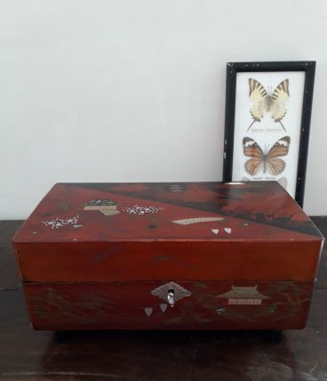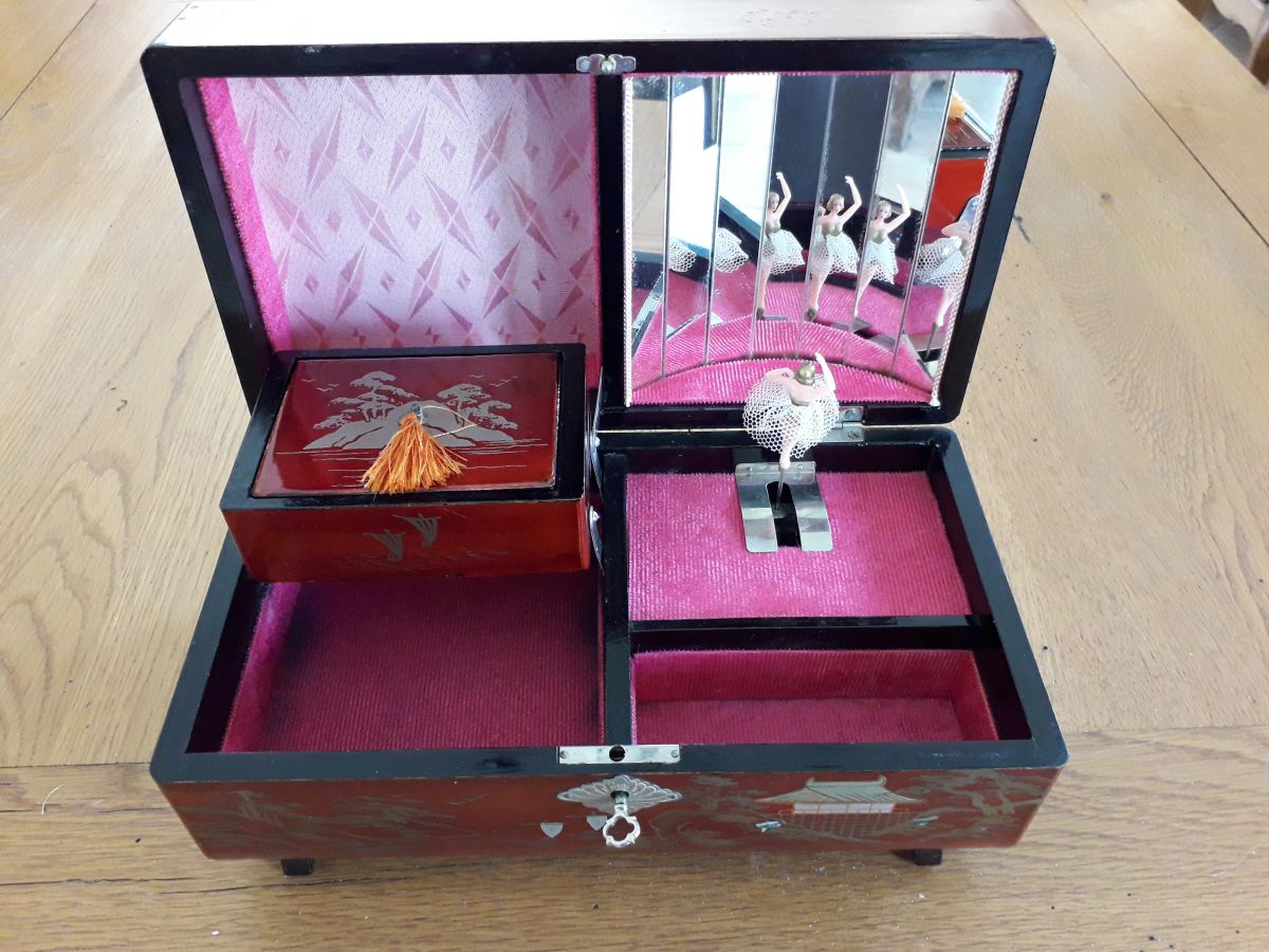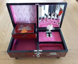 Délicat coffret à bijoux fabriqué au Japon. Représentant peut-être le mont Fuji. Quelques touches de nacre incrustées dans le décor. La jolie danseuse veillera sur vos trésors en virevoltant sur une petite musique quand il ne sera pas fermé à clé.