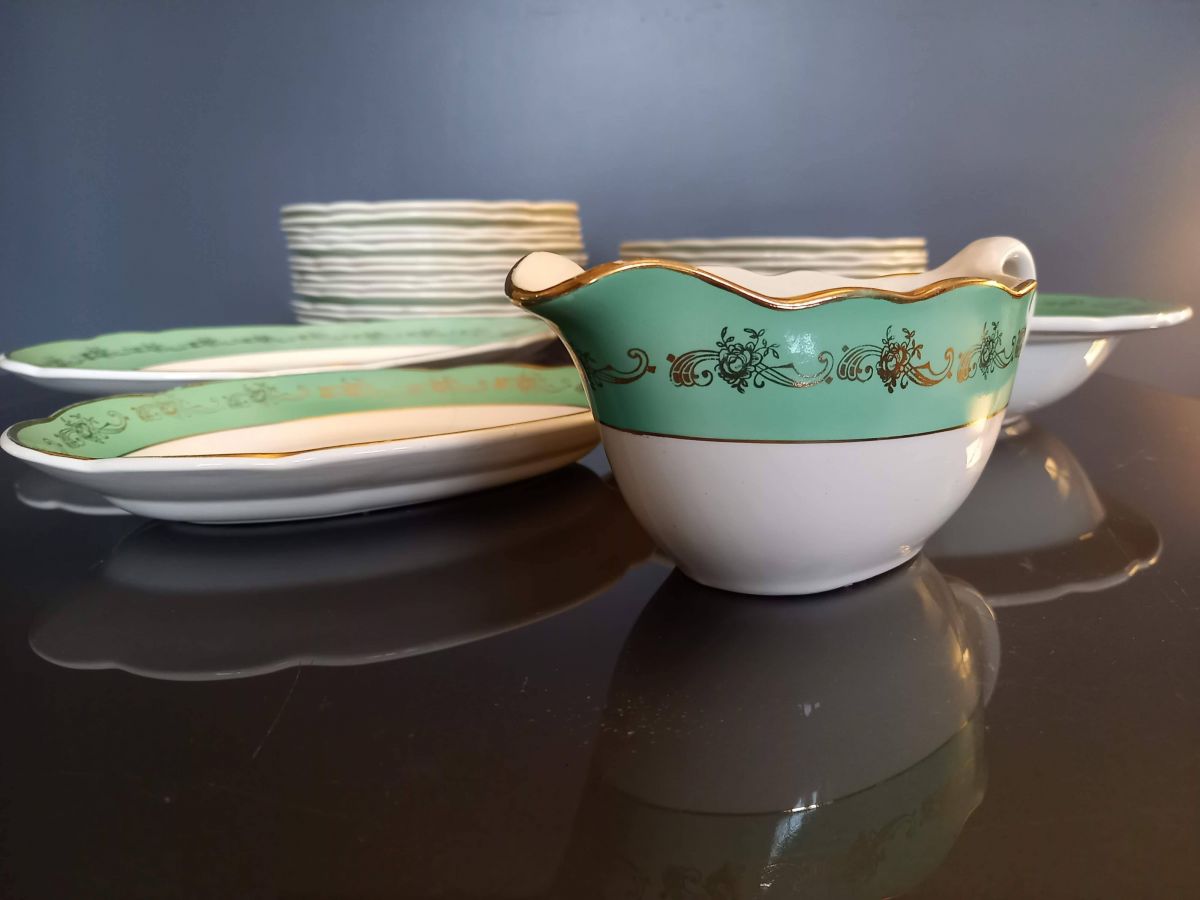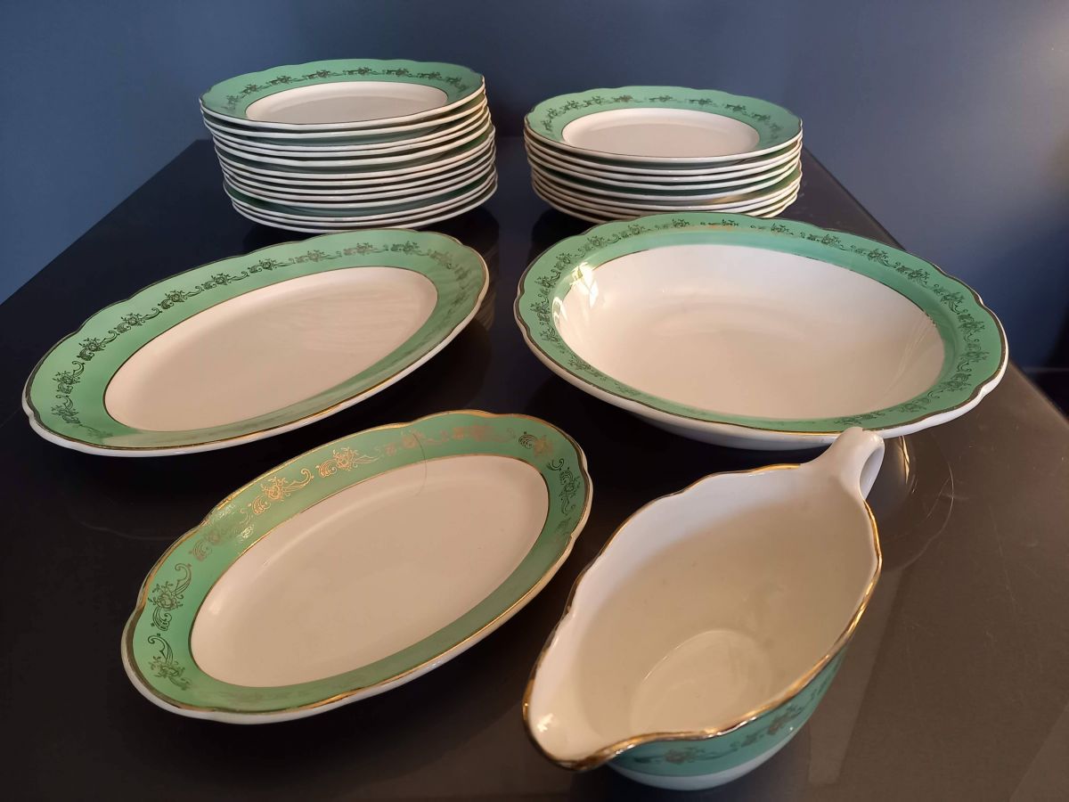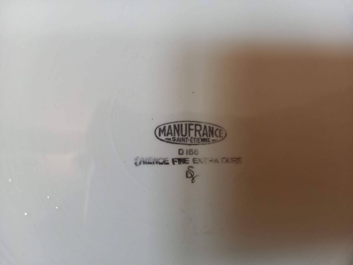 Lot de 27 pièces de service en porcelaine de St Etienne, style ancien (années 30/50) marqué Manufrance D156 faïence fine extra dure au dos.
