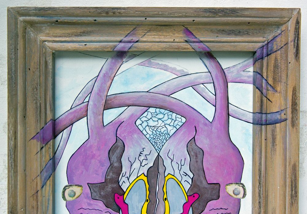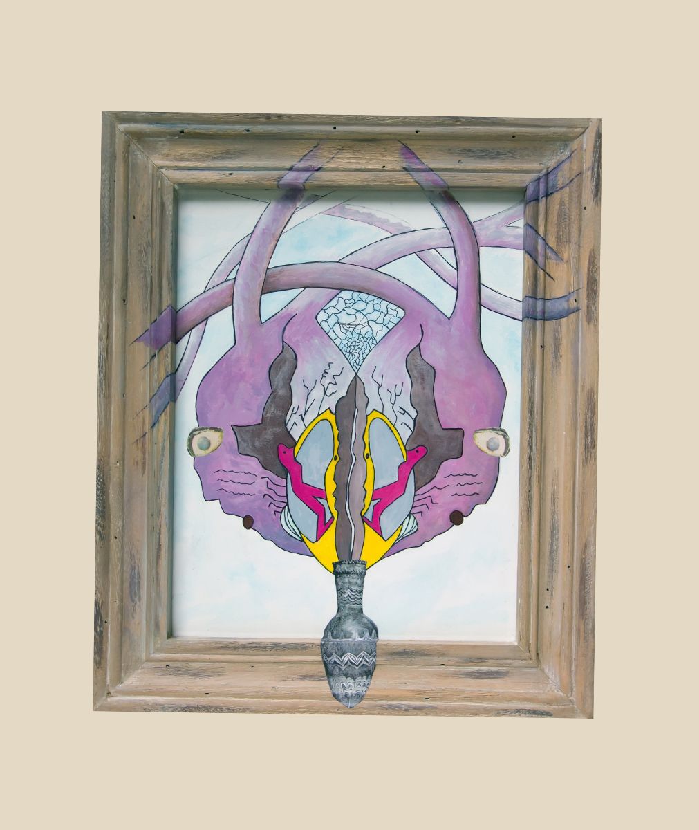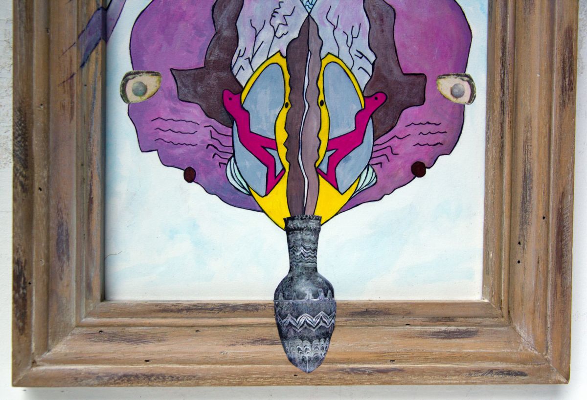 Travail constitué d'un dessin et d'un cadre avec des collages.