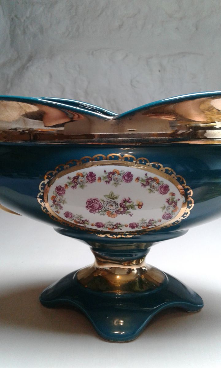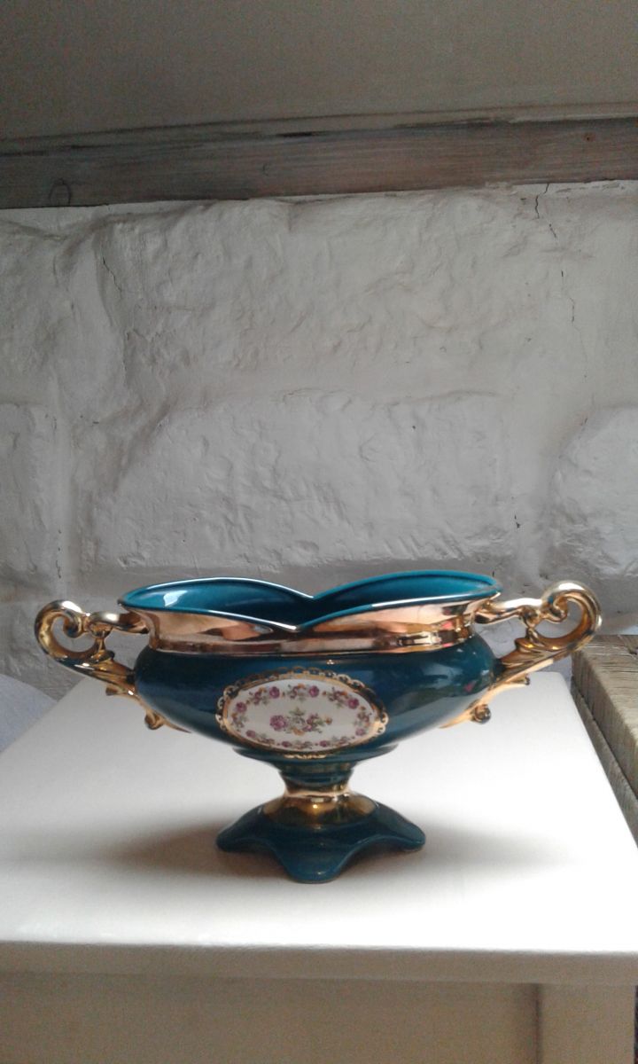 Vase gondole en ceramique estampillé et numéroté provenance Italie, decort floral sur fond couleur vert émeraude en Bonne état noté quelque traces d usage voir photos idéal dans une déco contemporaine année 50.