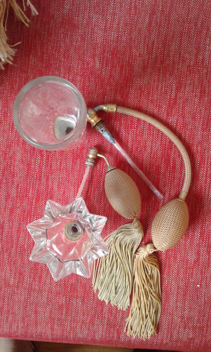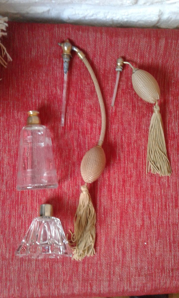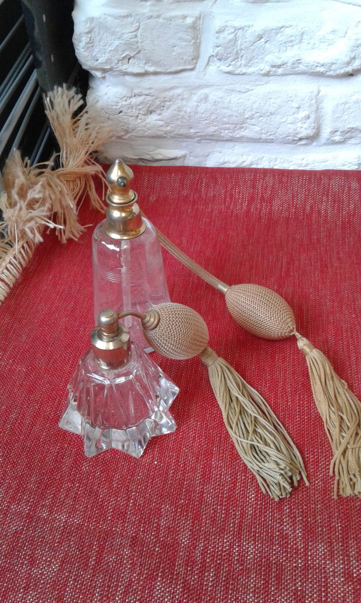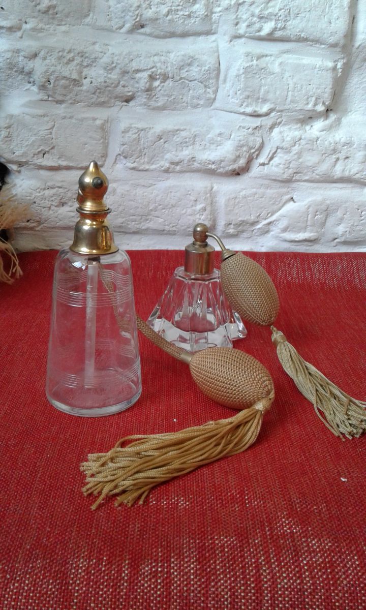 Ensemble de deux flacons de parfums à poire en verre ' époque Art Déco on peut encore y ajouter du parfum les poires fonctionne a noté trace d usage manque de dorure voir photos ''hauteur des flacons entre 14 et 8 cm.