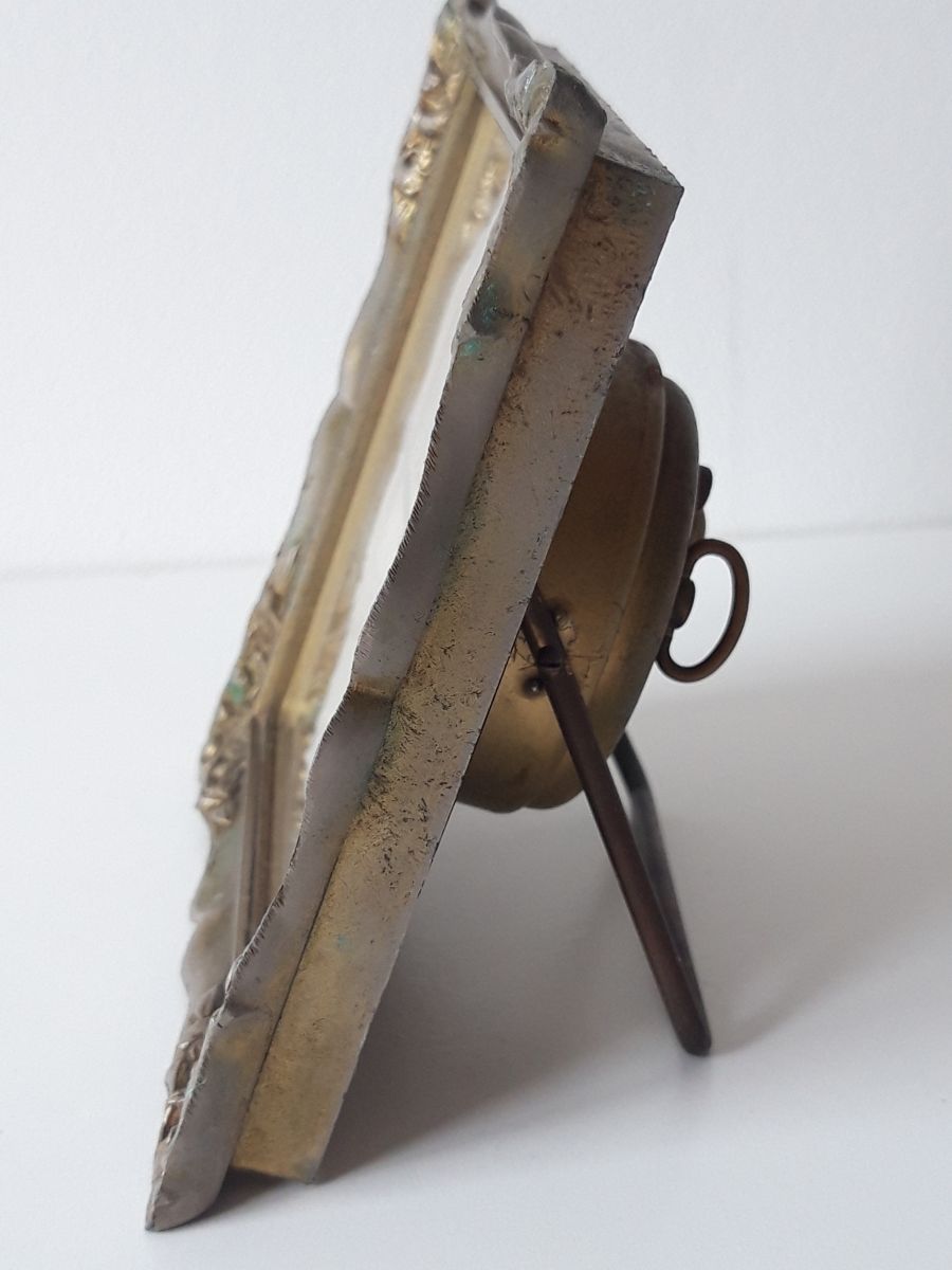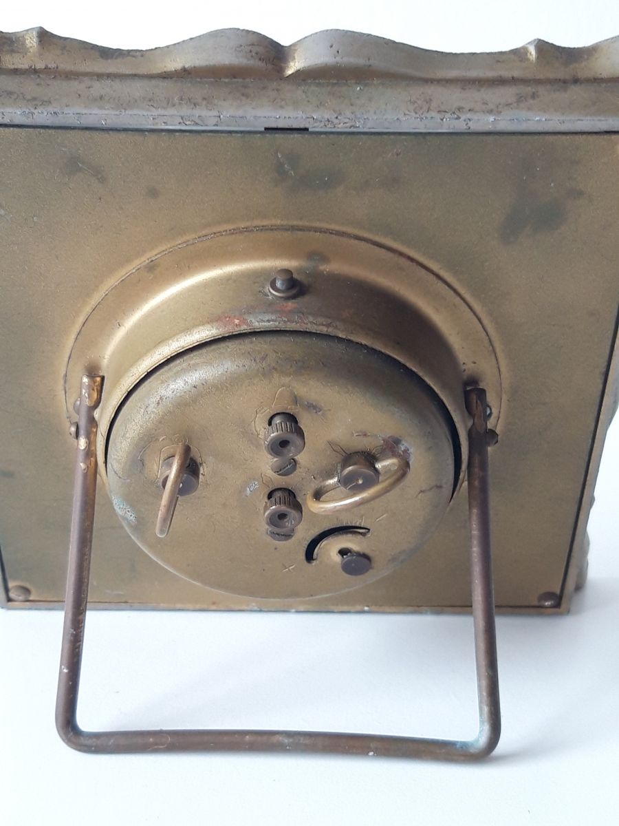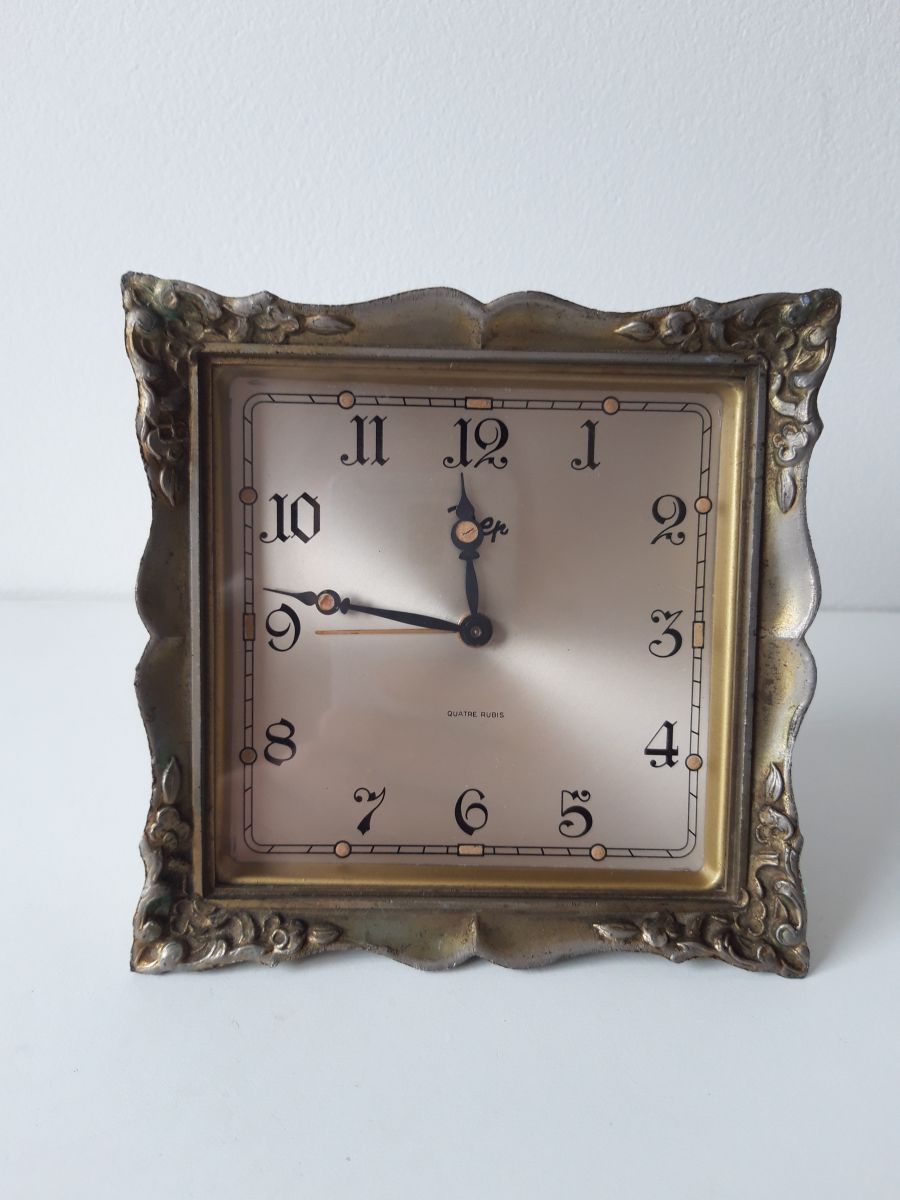 Jolie cadre en zinc/aluminium avec patine dorée. La patine a vieillie, ce qui donne une touche de charme supplémentaire à cet élégant reveil.
