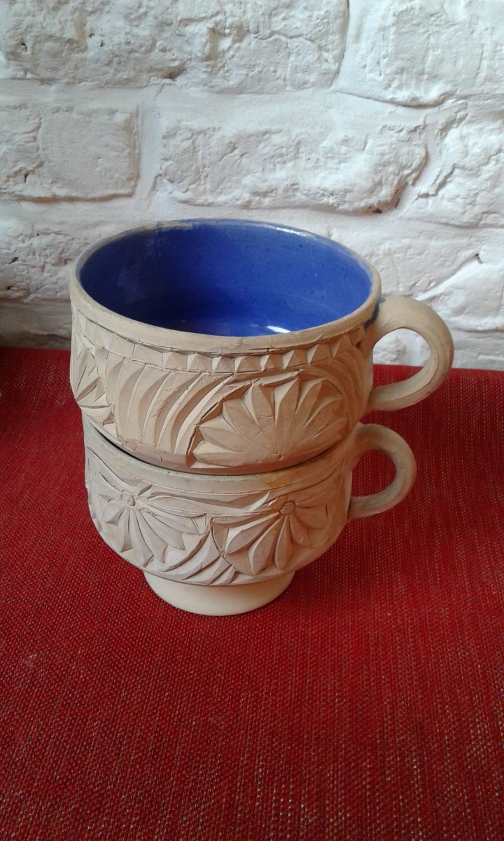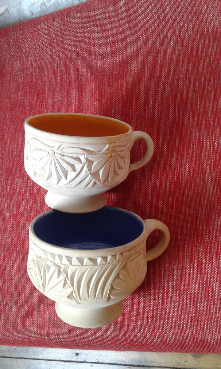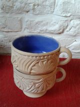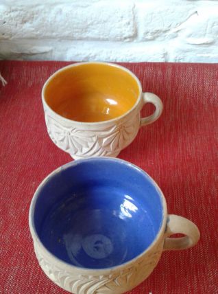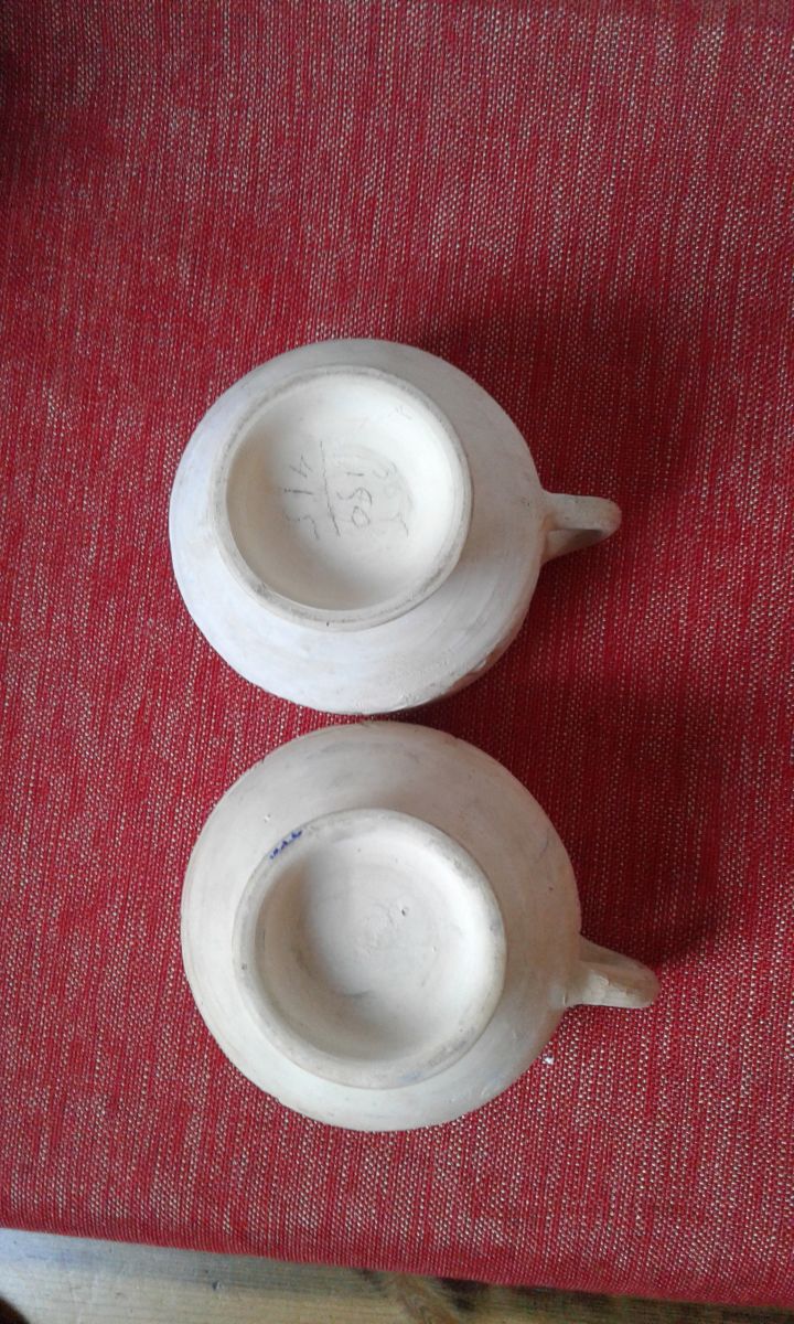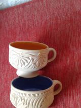 Ensemble de tasse en terre cuite émaillée a l intérieur pièce unique année 70 une tasse mesure 9 cm de hauteur et 34 cm de diamètre , le travail est artisanal.