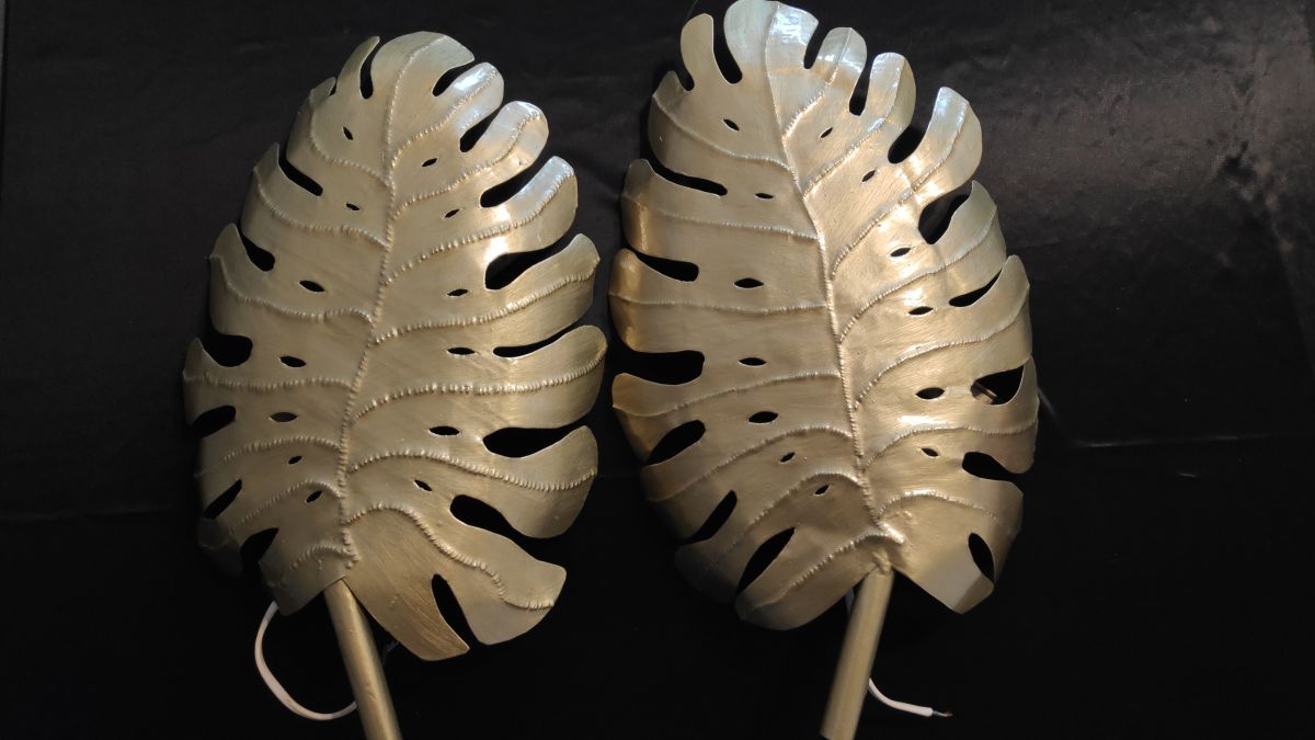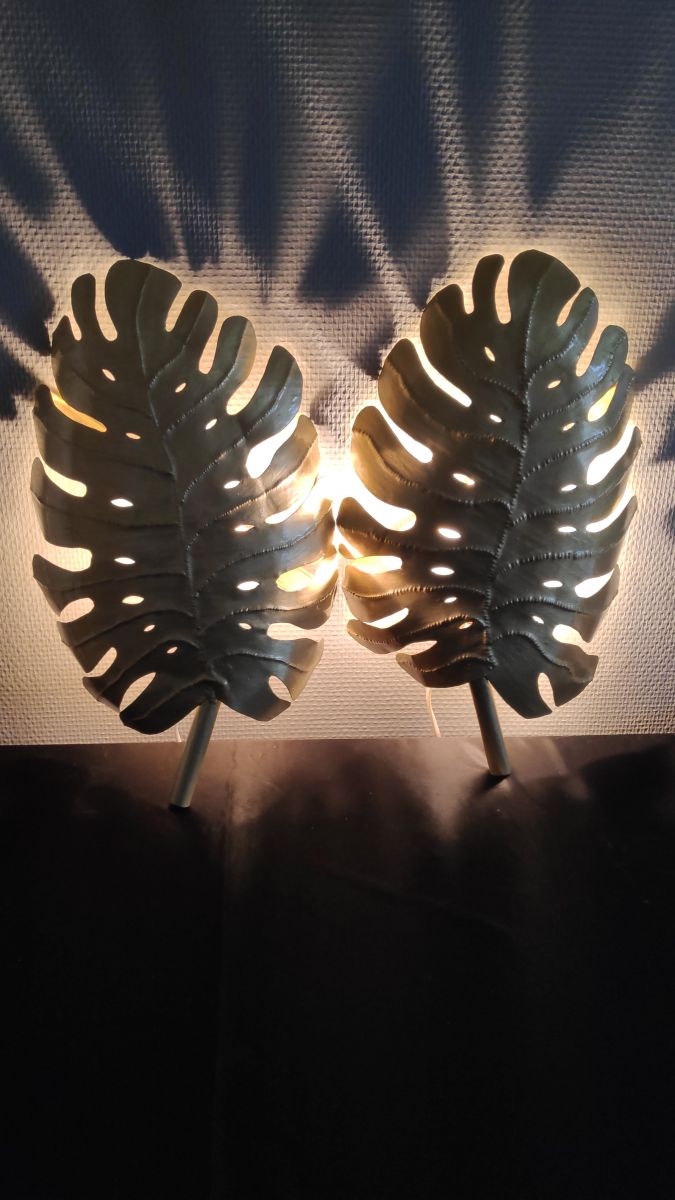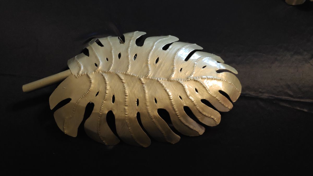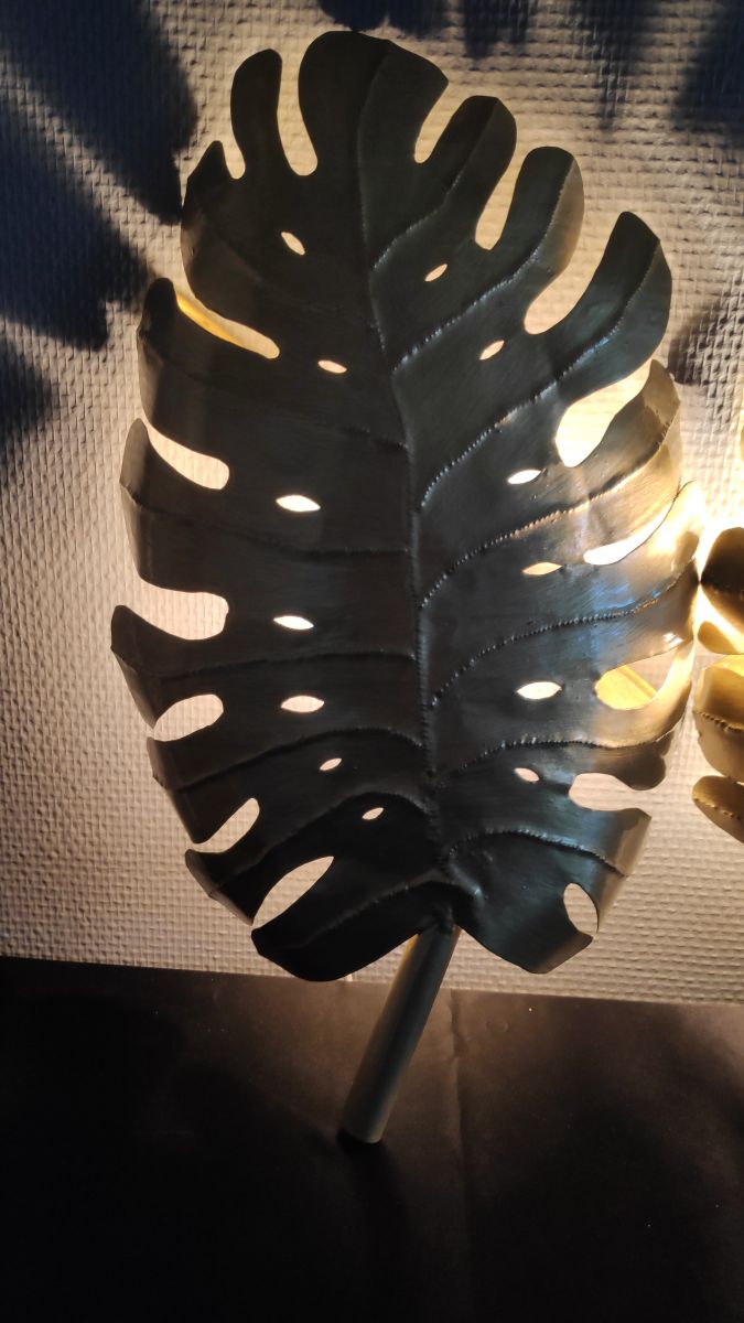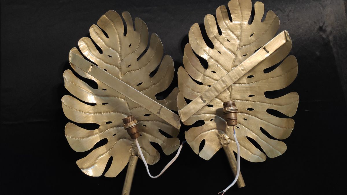 appliques feuilles murales en métal doré martelé avec support des années 70