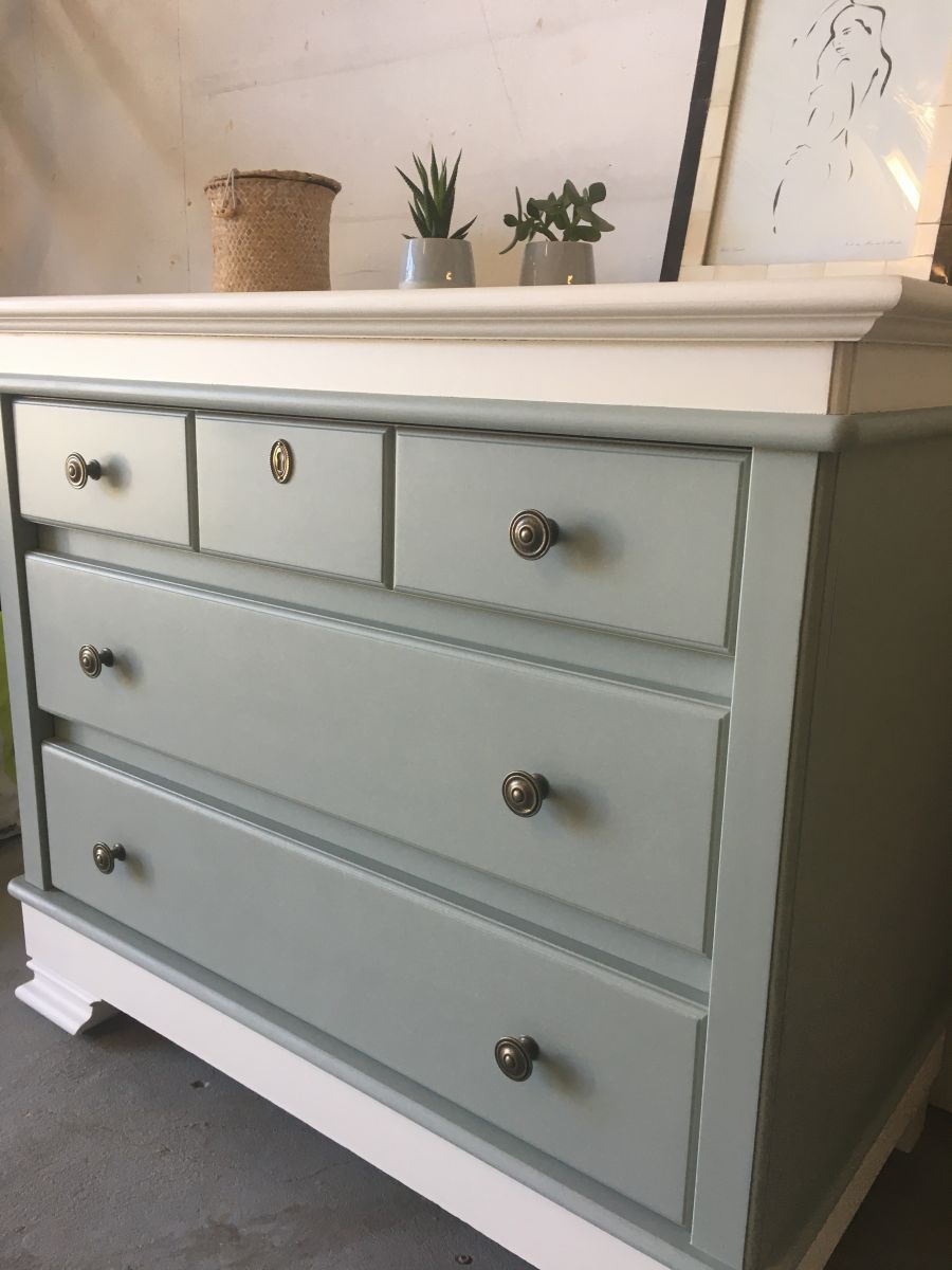 Très belle commode 3 tiroirs vert de gris et blanc cassé