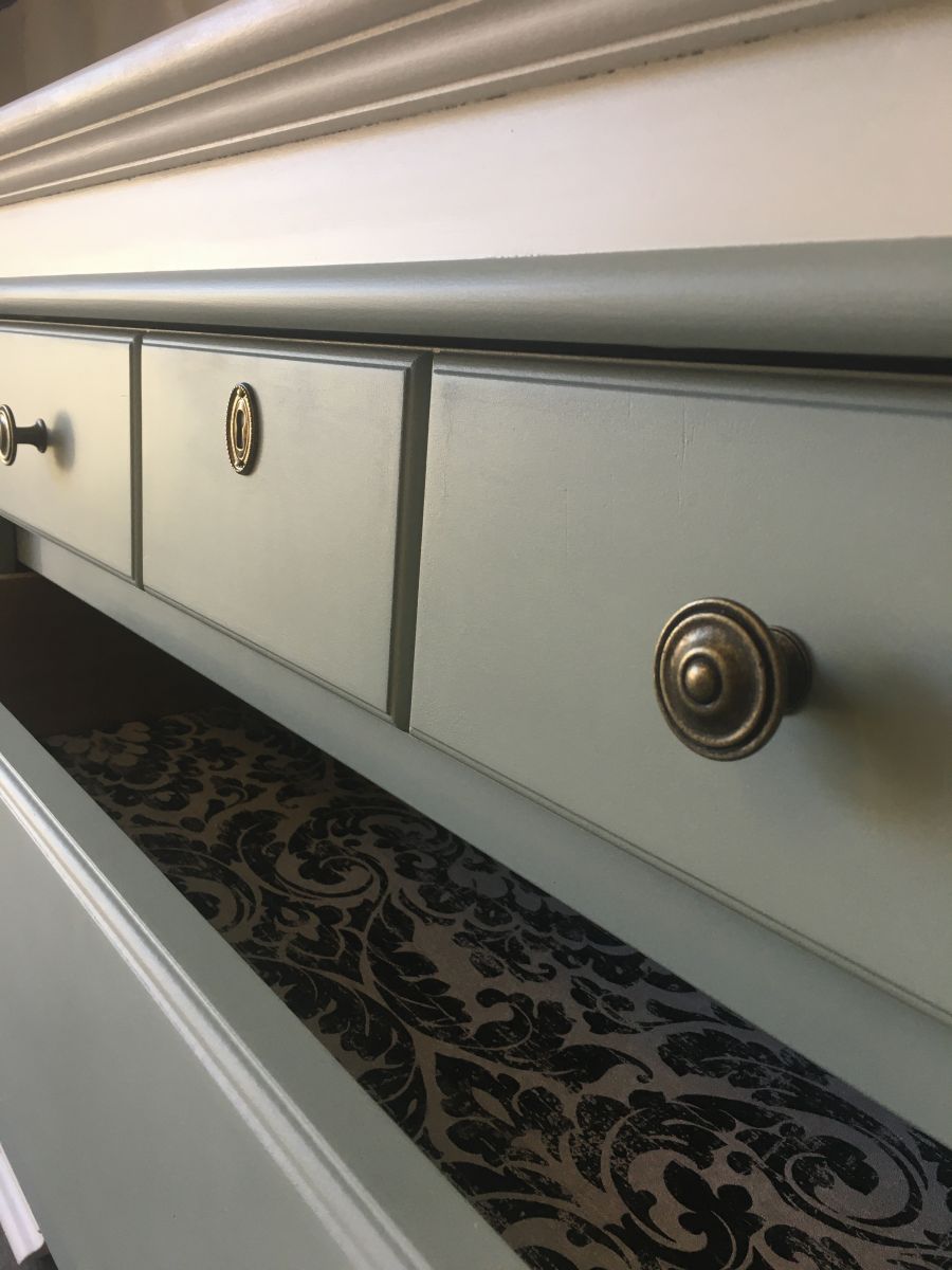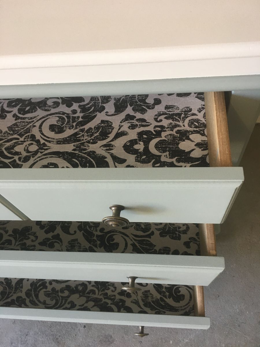 Poignées neuves , papier peint installé dans chaque fond de tiroirs.