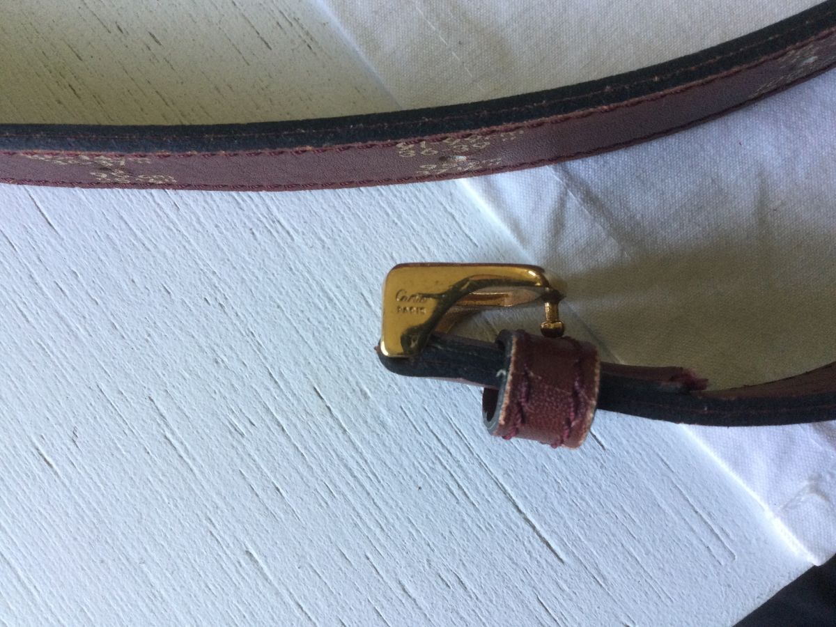 Ceinture de mesure de taille "Must de Cartier" article vintage couleur bordeaux (rouge Hermès) 121x3 cm. Attention, il s'agit d'une ceinture de mesure de taille avec annotations de tailles à l'extérieur de la ceinture.