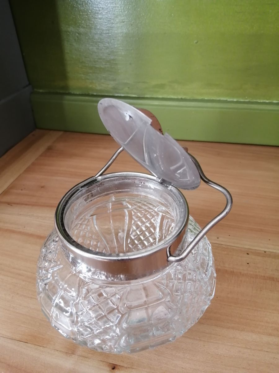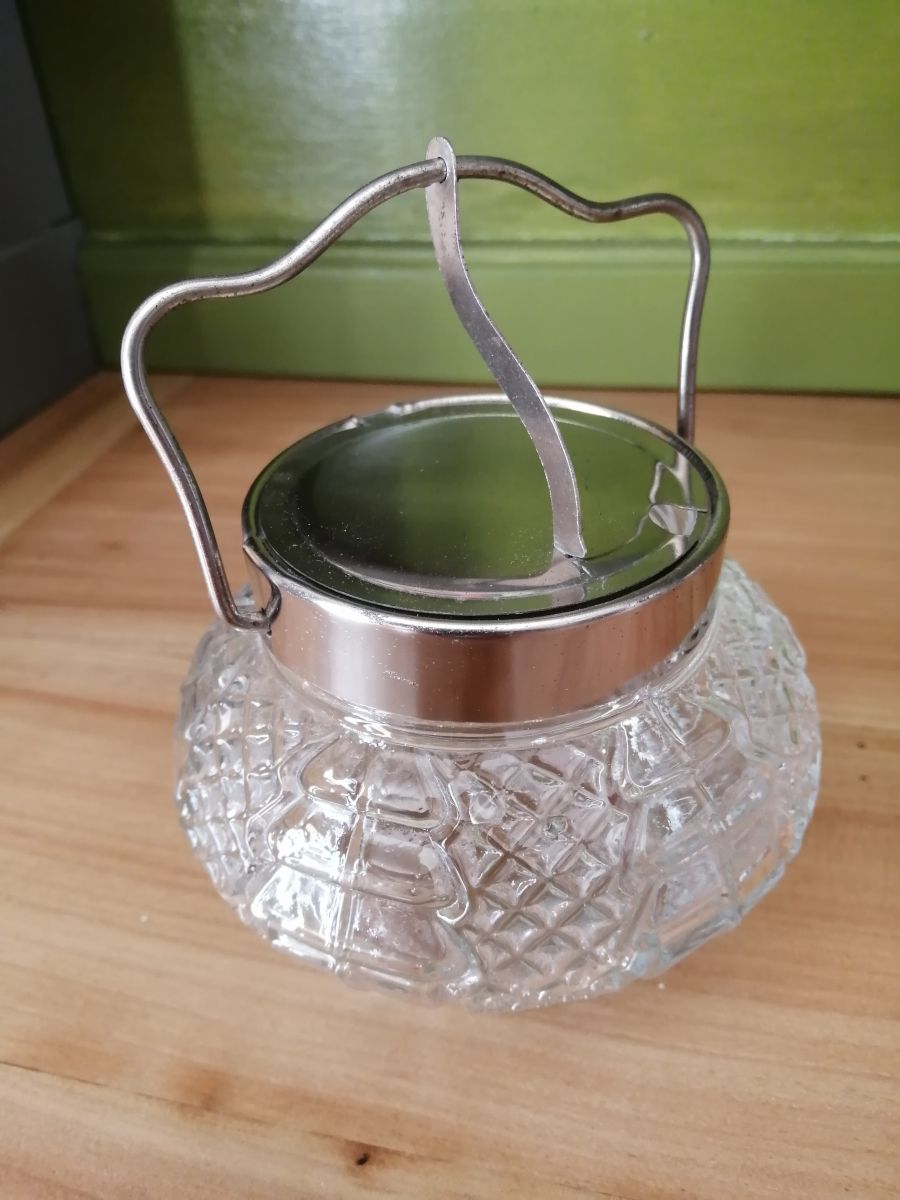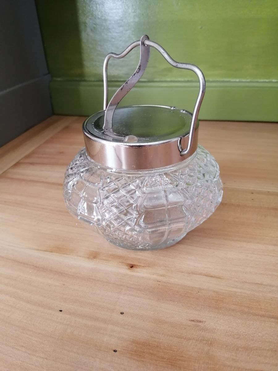 Sucrier en verre moulé et métal argenté. Système de levier pour ouvrir le couvercle. Quelques traces d'oxydation