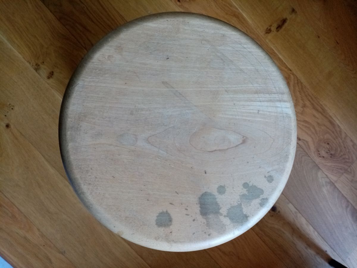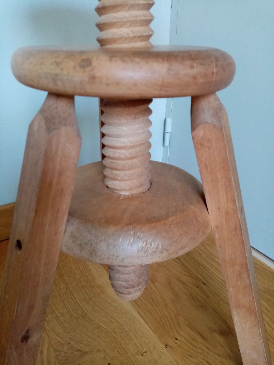 Charmant tabouret tripode à vis en bois clair massif.il est encore très solide mais ne cache pas son âge, peut-être des années 50 (têtes de vis plates, pas cruciformes), mais sans certitude. Il comporte rayures (notamment une dizaine, très rapprochées sur le disque du bas), éraflures et taches diverses indélébiles (notamment sur l'assise). La hauteur maximale est de 66 cm, la hauteur minimale de 49 cm. L'assise a un diamètre de 29 cm. L'empiètement au sol est un triangle d'une quarantaine de cm de coté. Il pèse environ 3 kg.