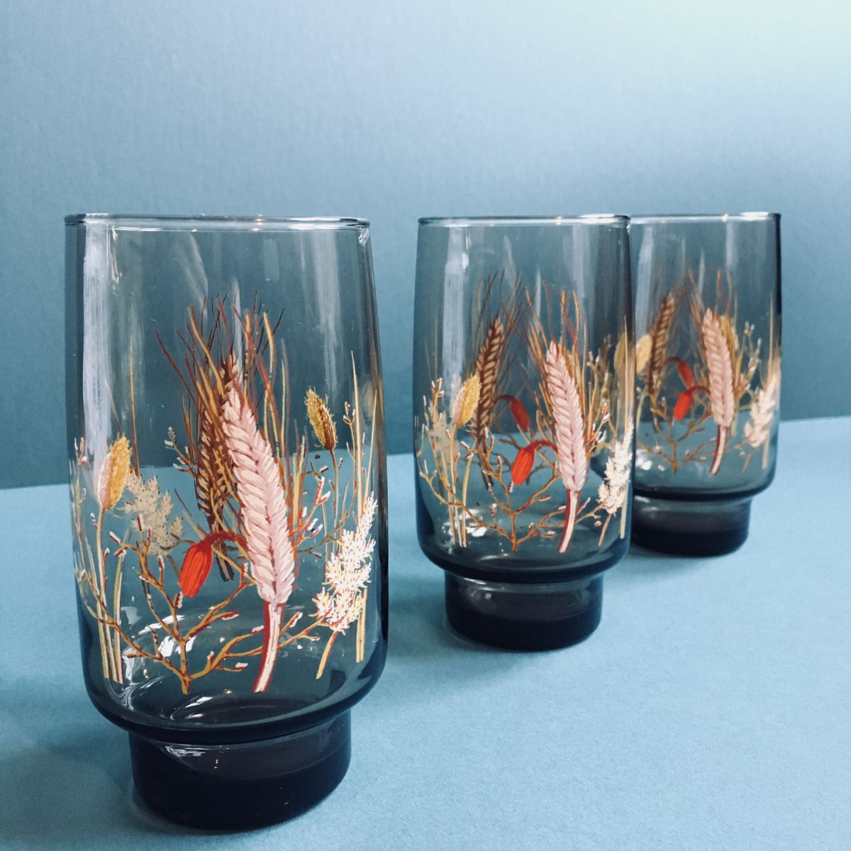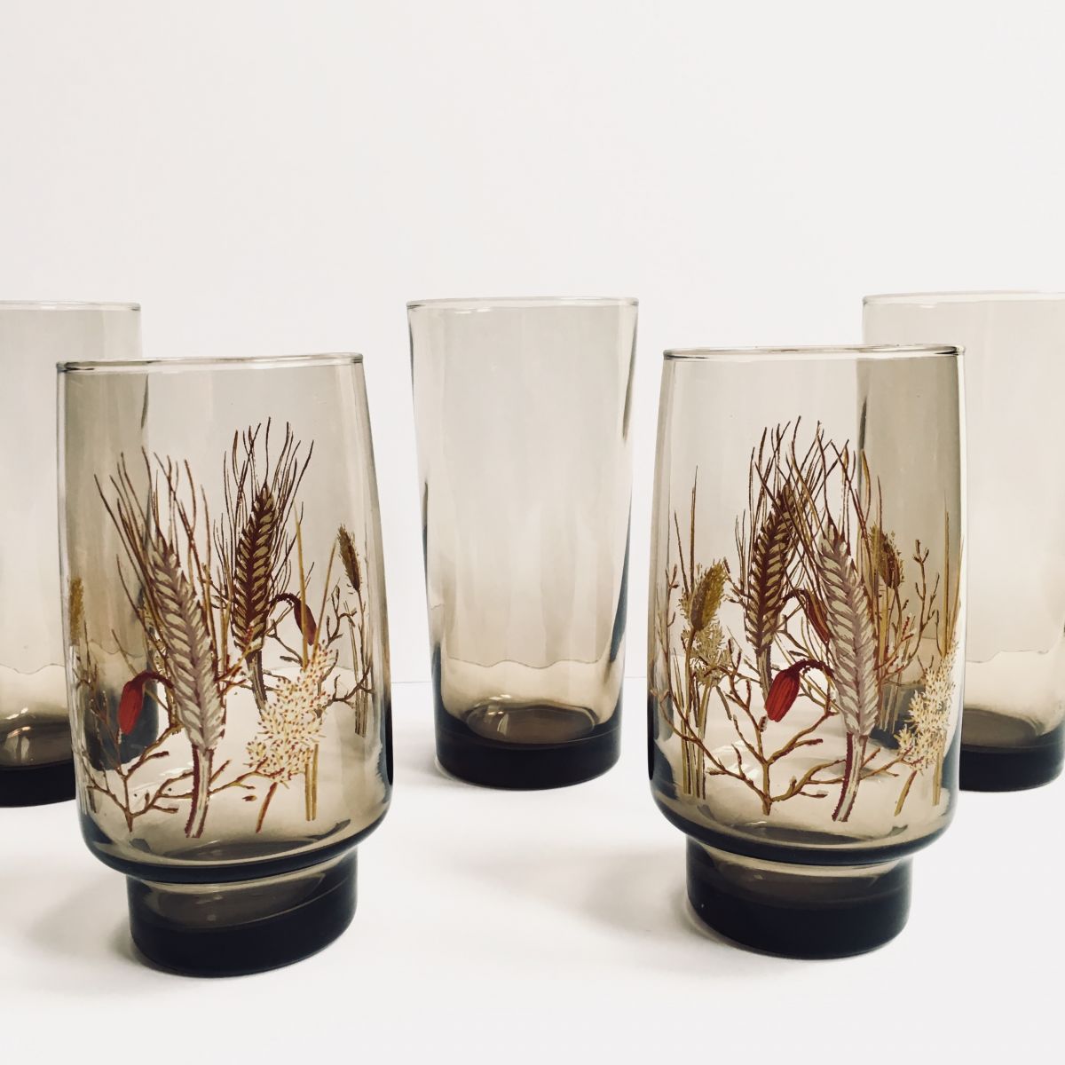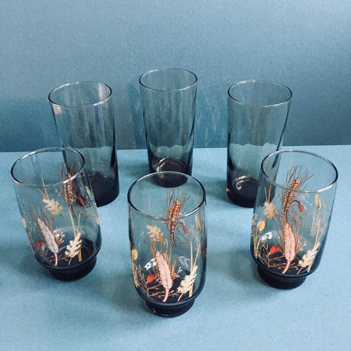 ♻️ Je vous propose cet ensemble de 6 verres vintage à la couleur "brun fumé" . Il se compose de 3 verres texturés façon "losange" et 3 verres au décor champêtre "épi de blé". Inspiration 70's du plus bel effet ♻️