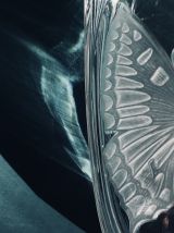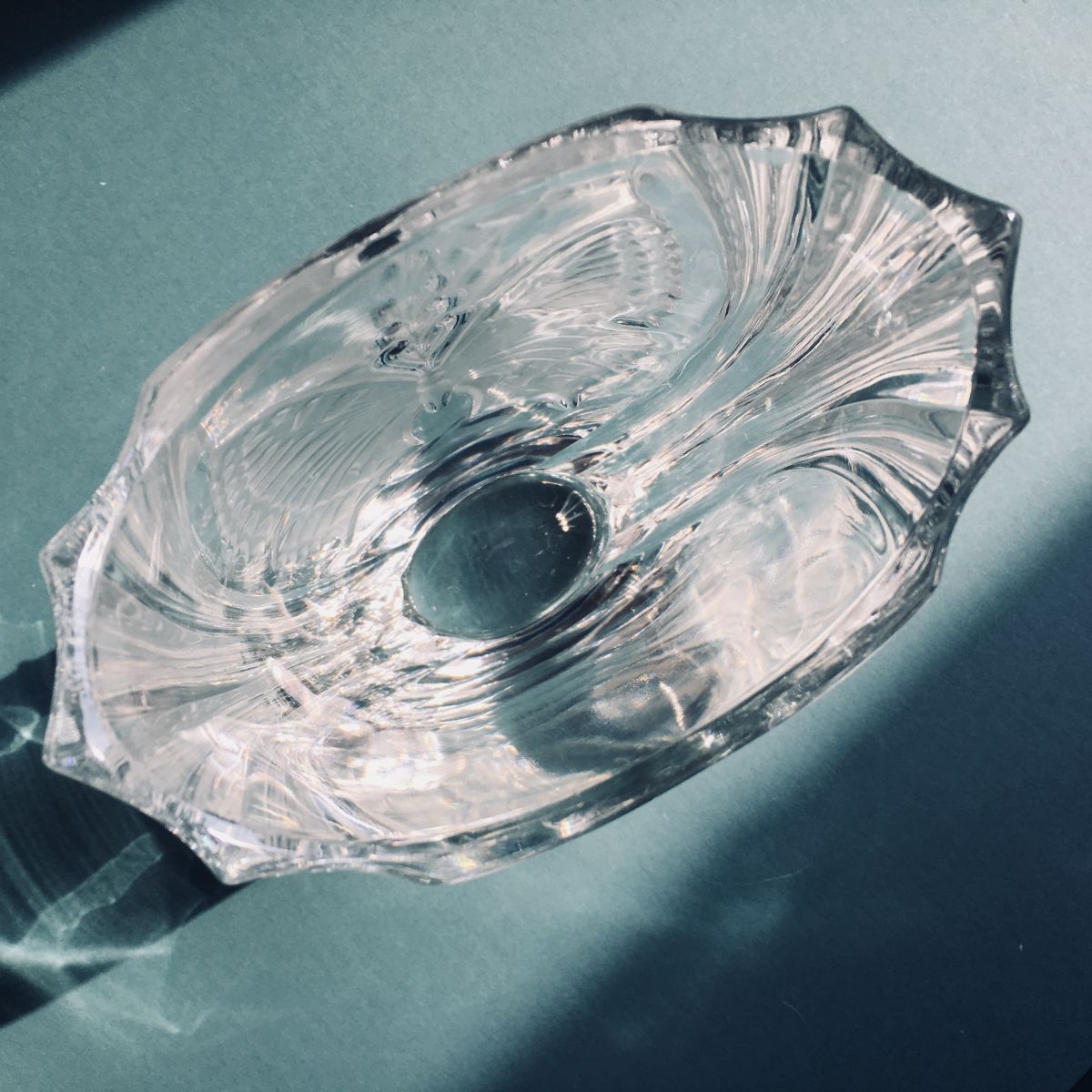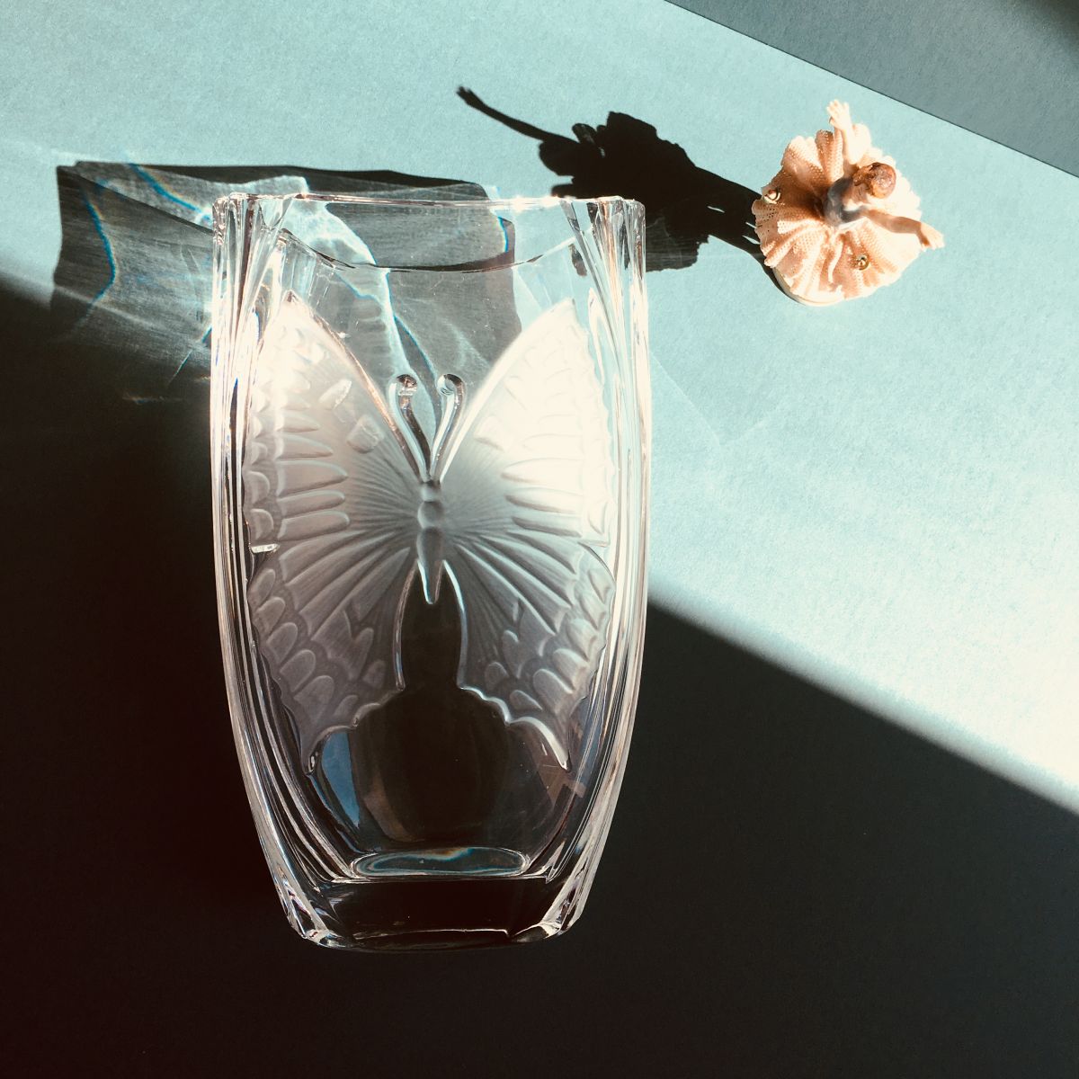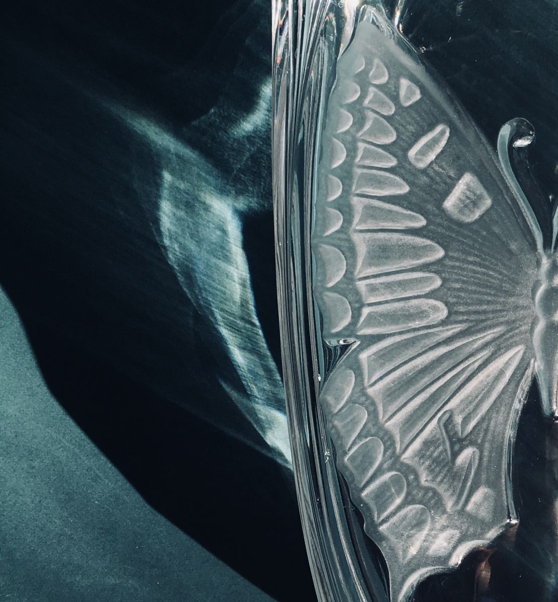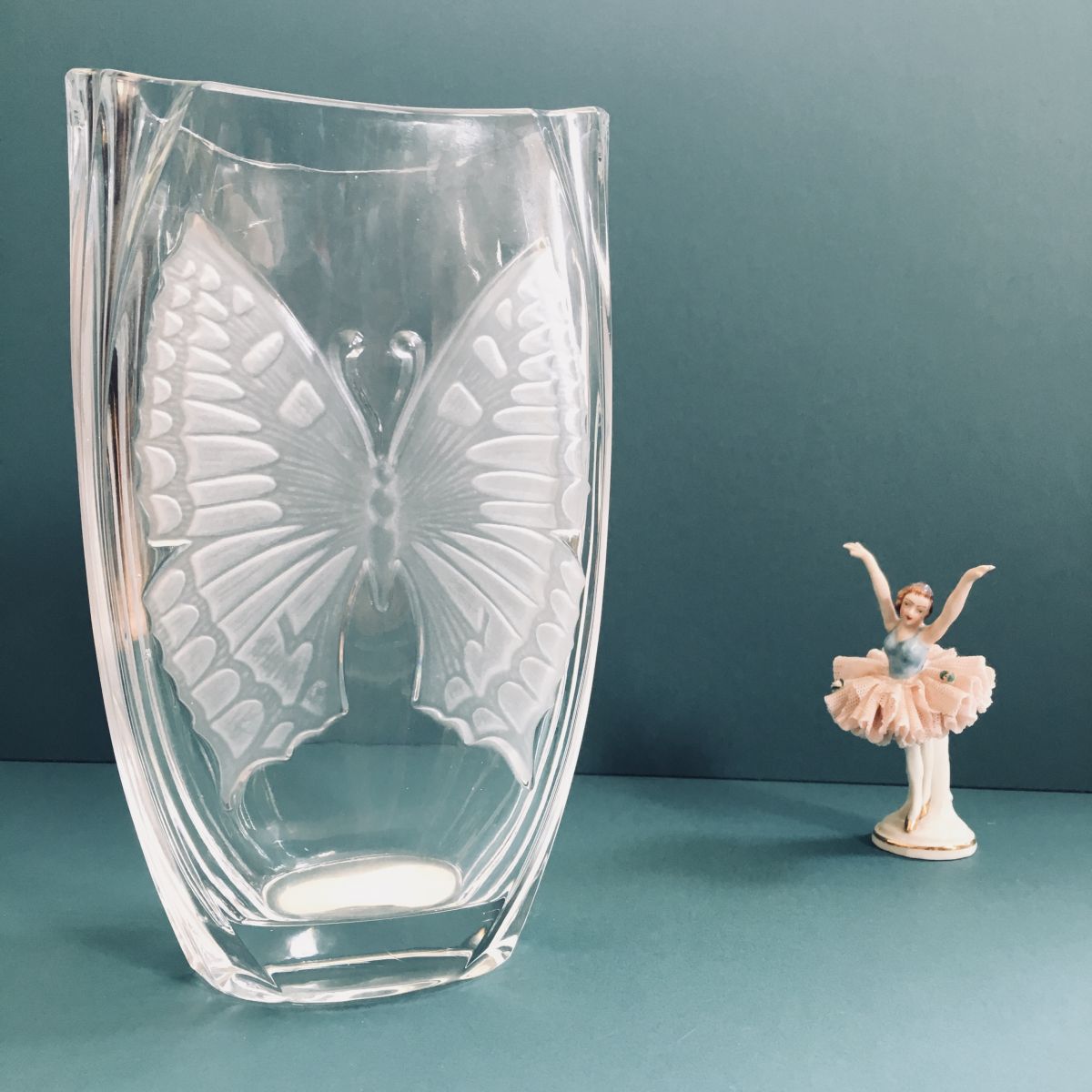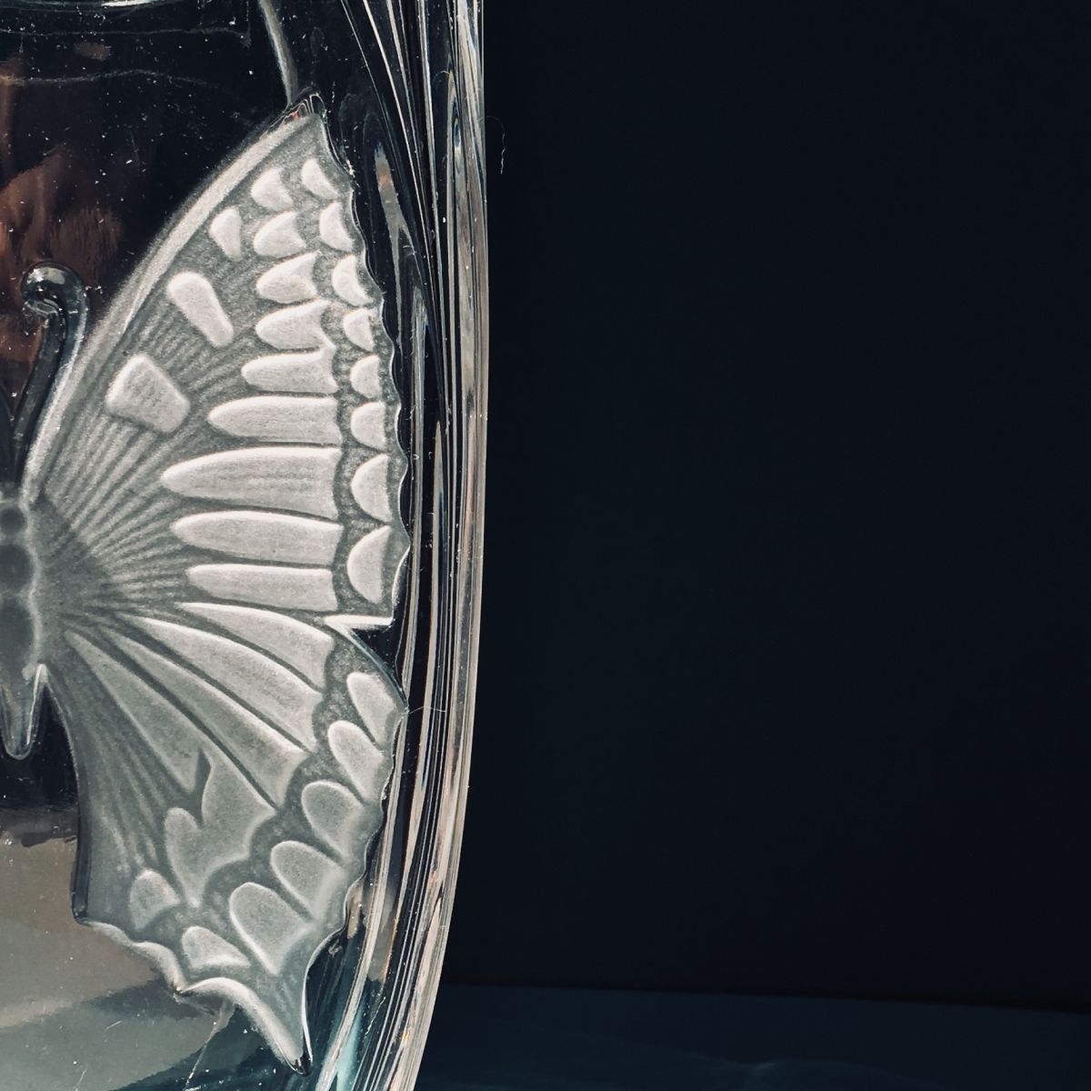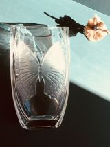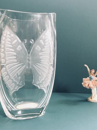 Beau vase vintage en verre épais et motif dépoli papillon