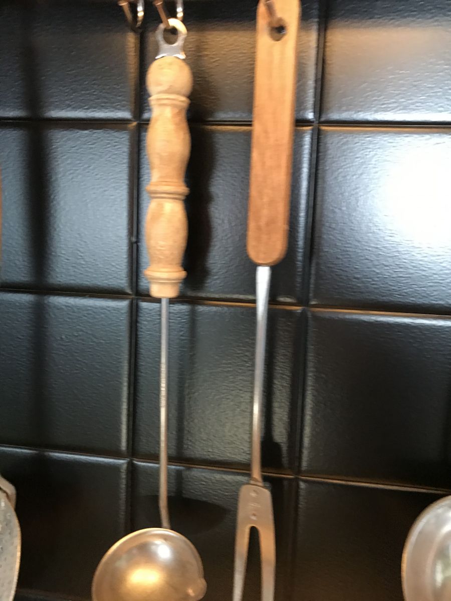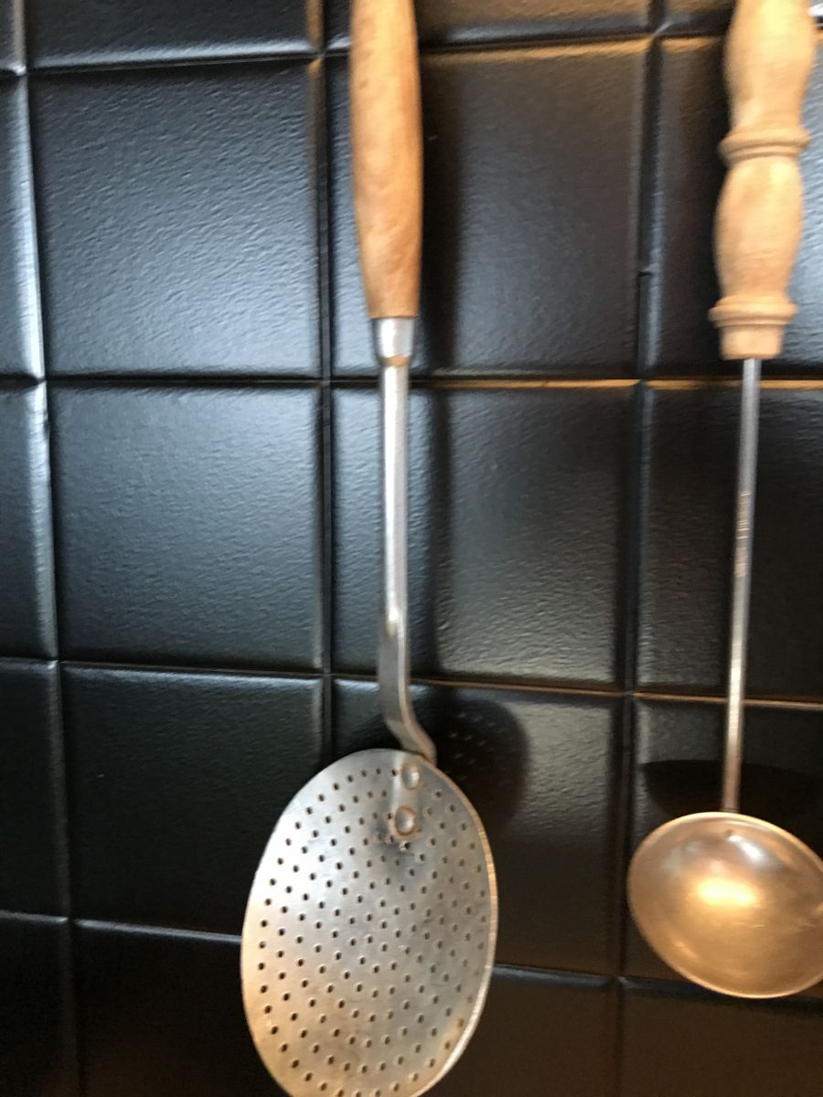 Ensemble de 5 ustensiles de cuisine vintage avec manches en bois qui vont d'environ 32 à 38 cm de longueur
