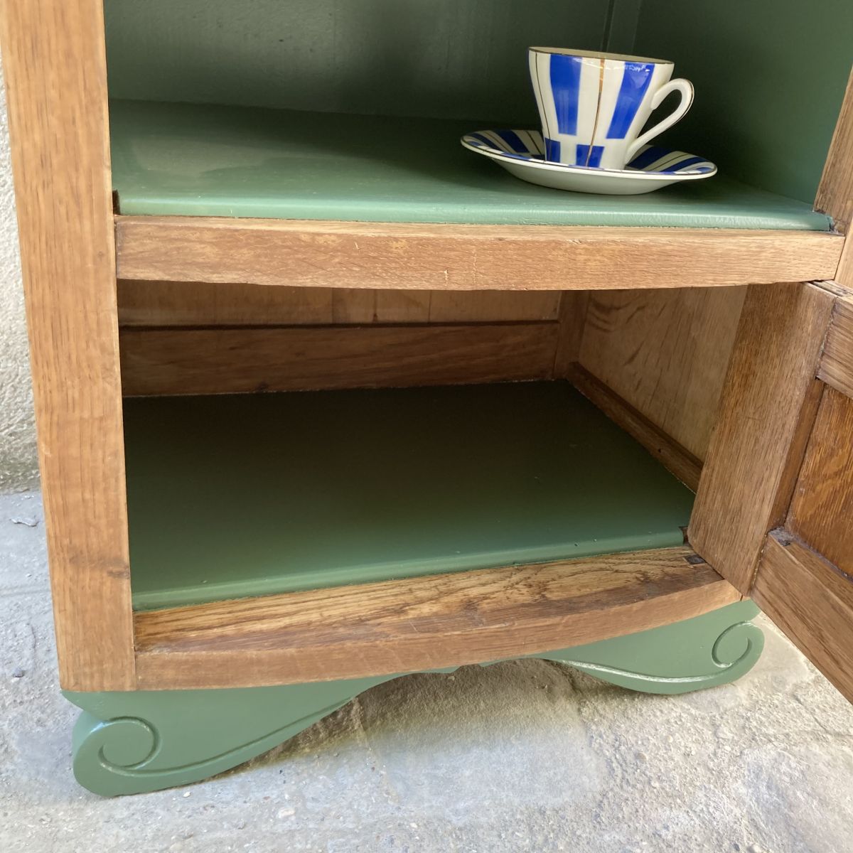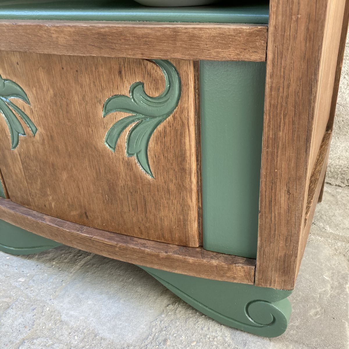 Le chevet est en bois ciré chêne clair et vert eucalyptus.Il dispose d'une alcôve ouverte et d'un petit espace fermé par une porte avec joli décor art déco .