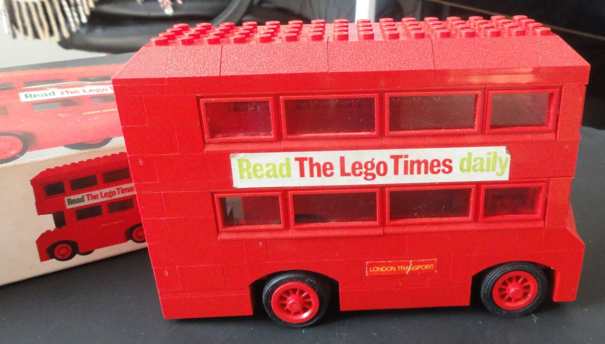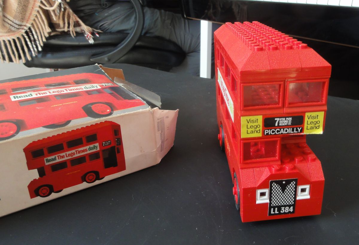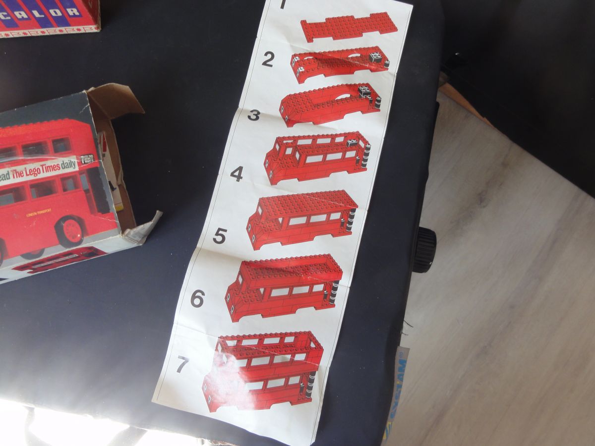 Bus Londonien en légo, boîte d'origine avec manque d'un rabat côté droit. Un stick à l'arrière du bus est légèrement endommagé. Notice d'origine et publicité Légo.