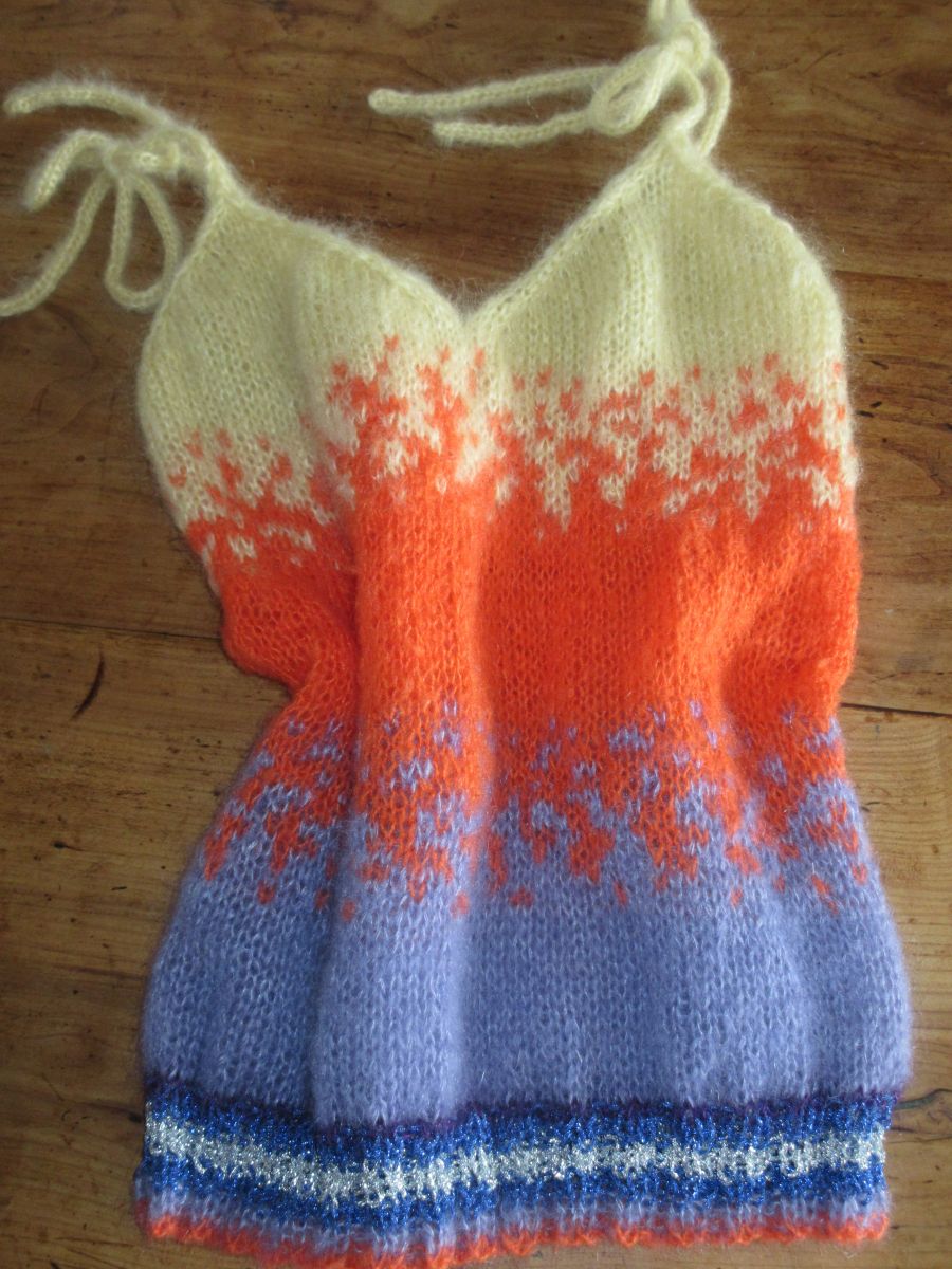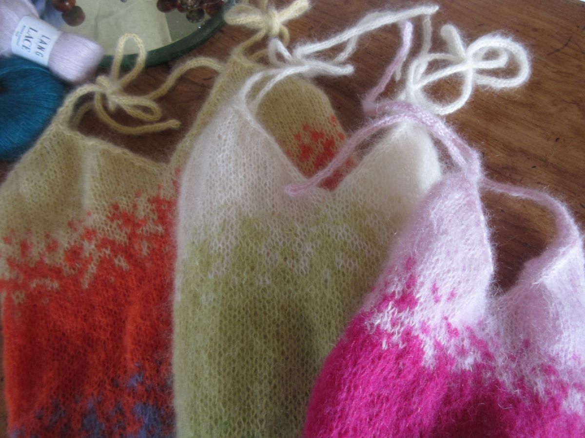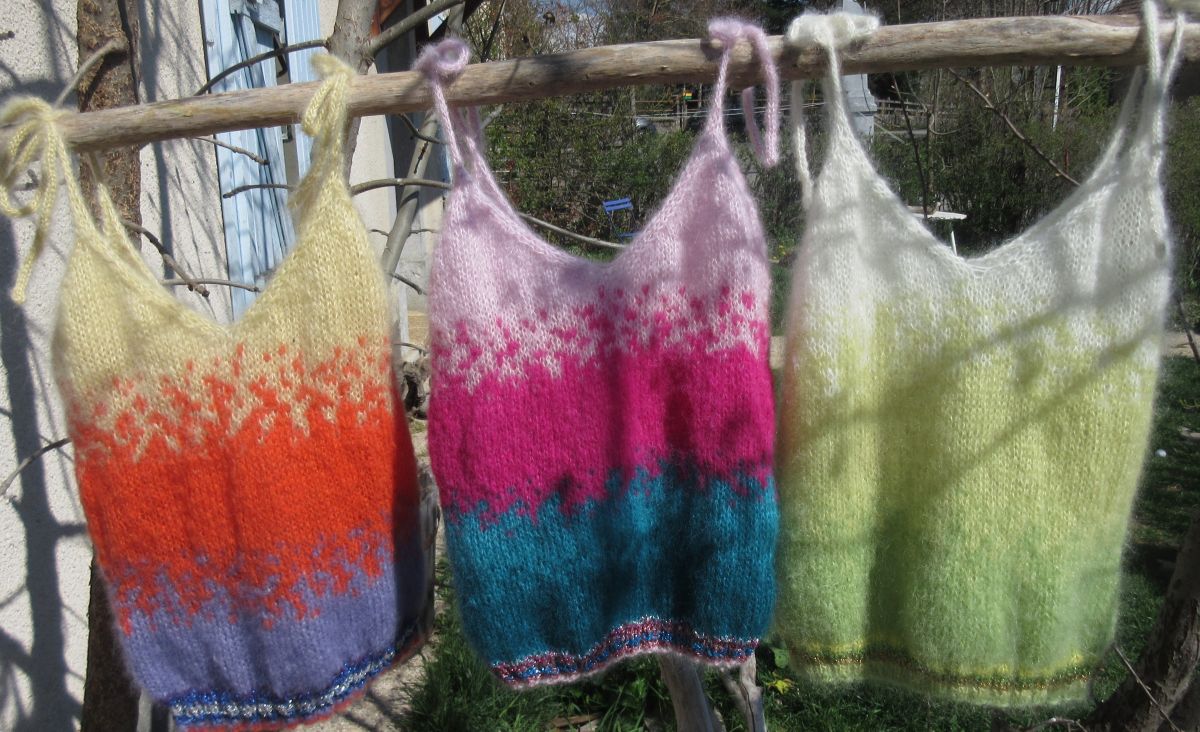 Trois couleurs, 3 modèles. Mohair et soie. Fait main 2021. Technique du point couleurs fondu. Terminaisons en lurex.