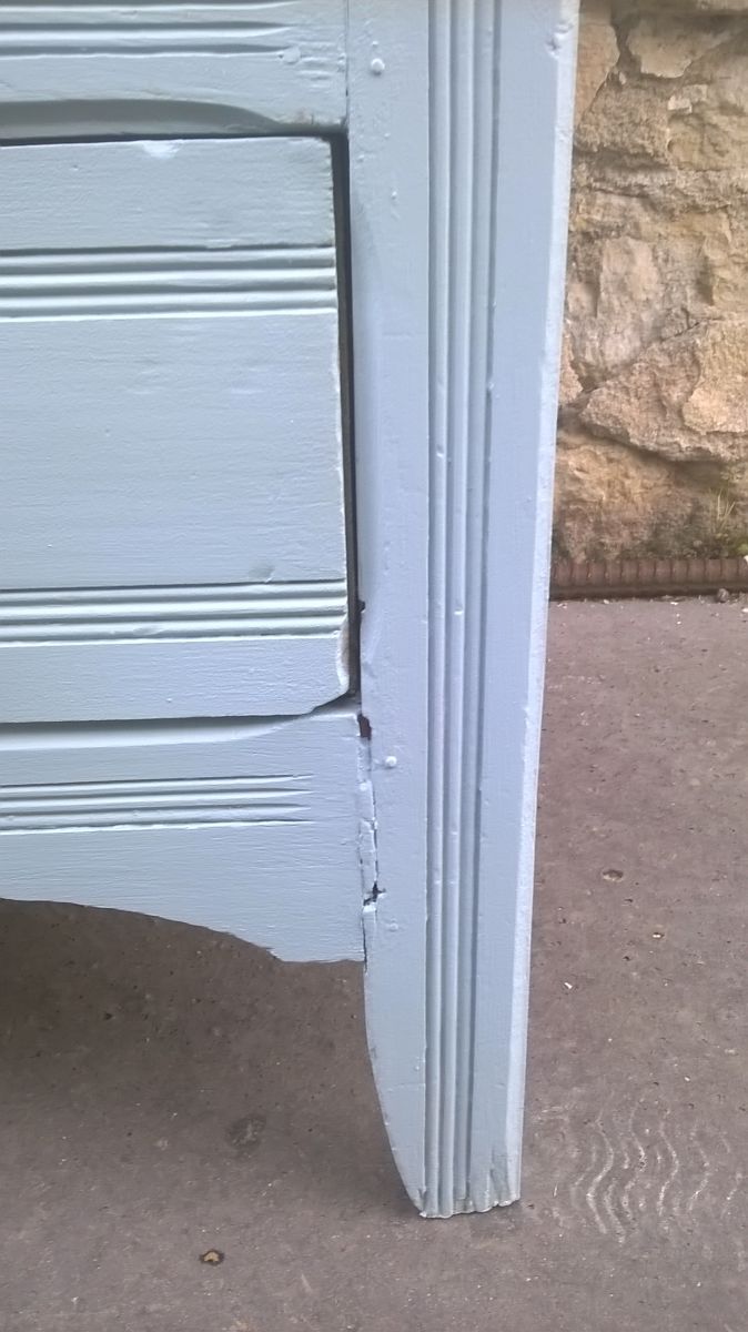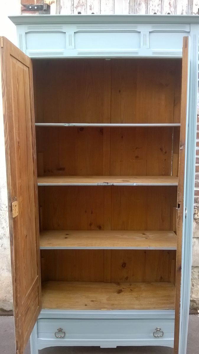 Armoire parisienne année 30. Elle a été poncé et repeint en bleu calme. Aménagé de 3 étagères et un tiroir en bas. la serrure est manquant. Quelques imperfection de l armoire du a sons Age. hauteur totale 209 cm. largeur 100 cm. profondeur 41 cm.