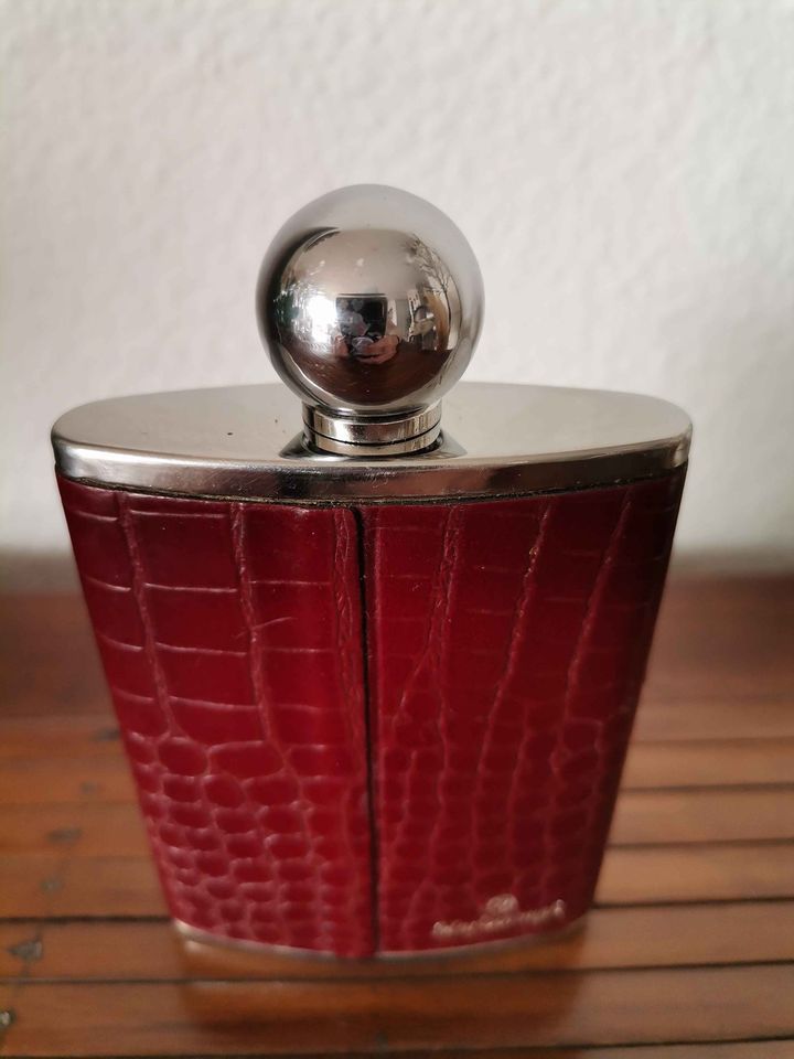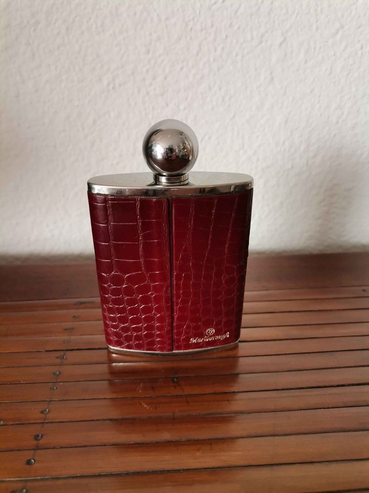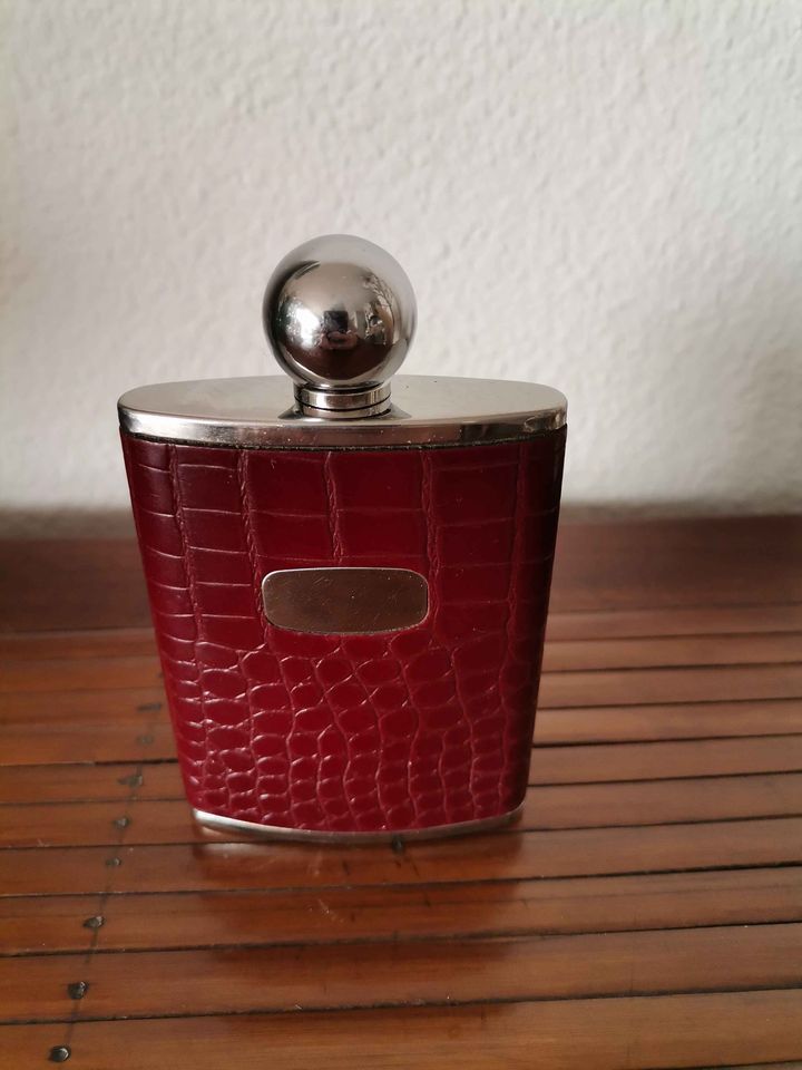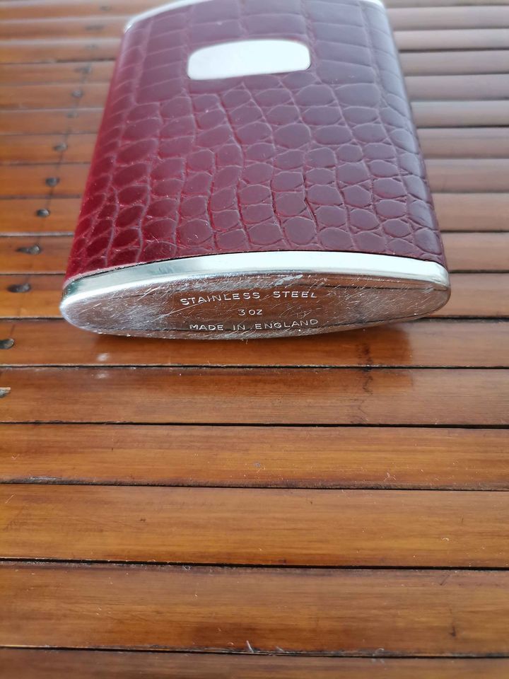Ancienne flasque à Whisky ou liqueur de la marque Marlborough en inox stainless gainée de cuir Bordeaux. Excellent état. Fabrique en Angleterre. 8x6cm