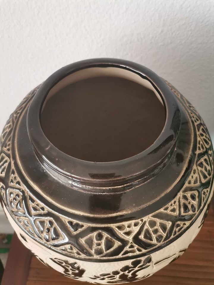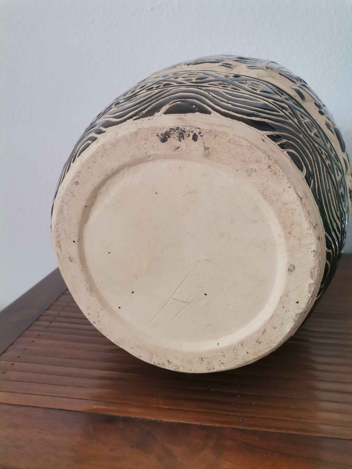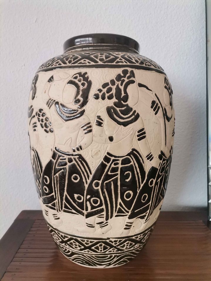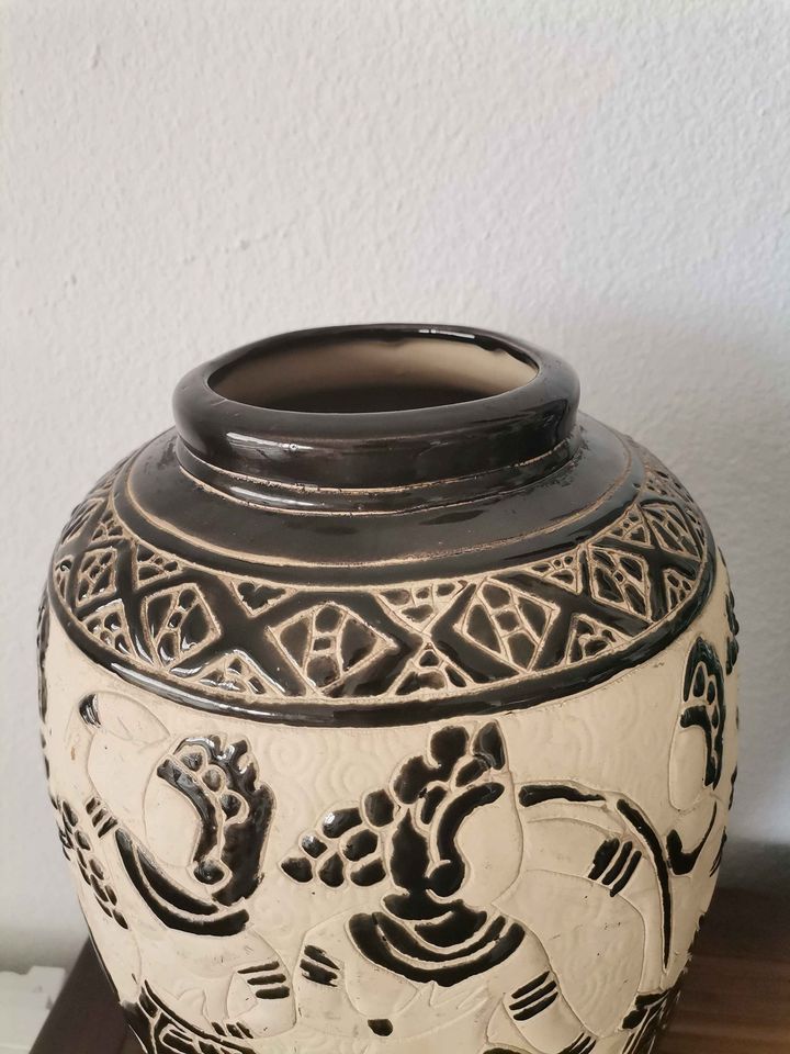 Très grand vase de forme ovoïde en grès et émaillé de noir décoré d'un groupe de danseuses