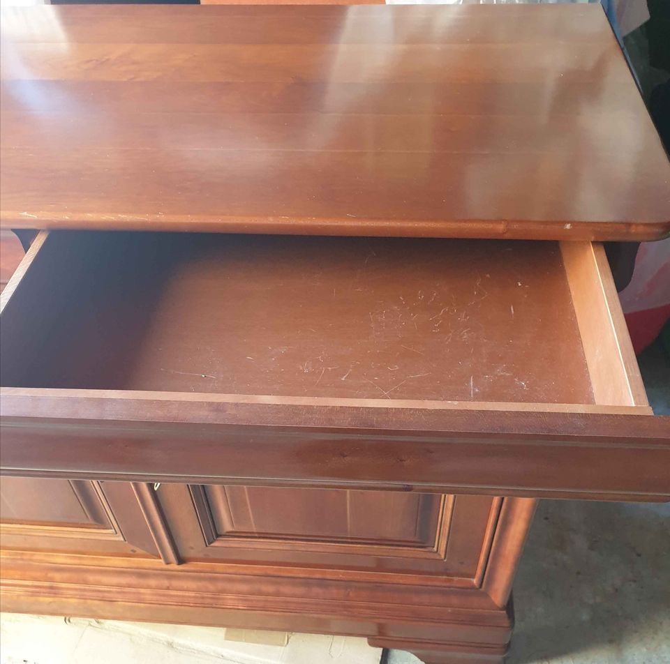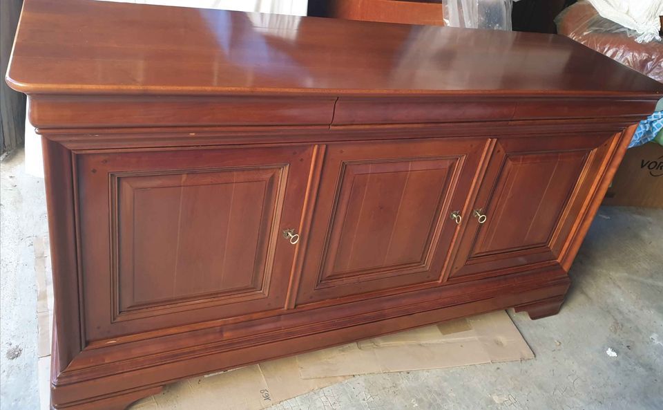 Enfilade 3 portes 3 tiroirs en merisier massif de style Louis Philippe en très bon état si ce n'est deux marques sur une porte et quelques traces dans tiroir