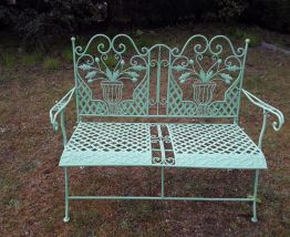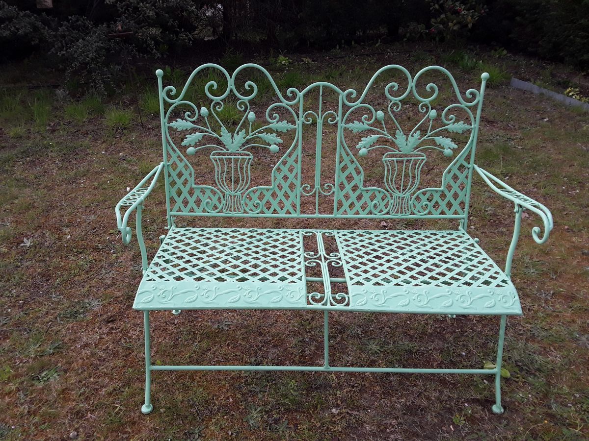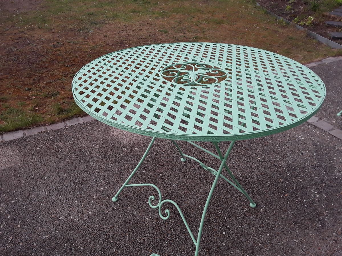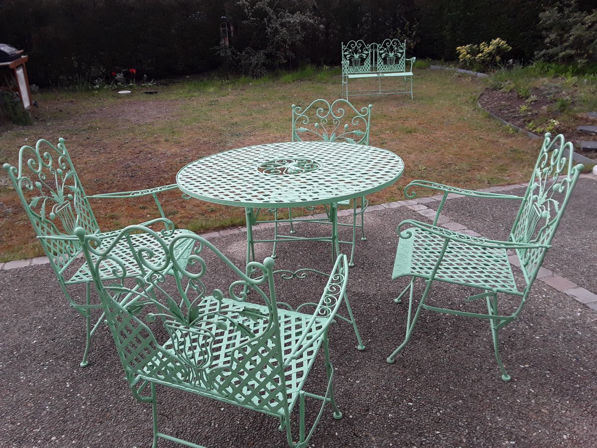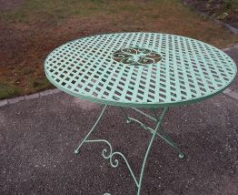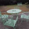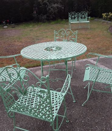 Salon ancien en fonte : 1 table diamètre 100 cms hauteur 80 + 4 fauteuils largeur 65 , hauteur 90, profondeur 50 + 1 banc 2 places largeur 120 , h 90, p 50. Motif feuilles de chêne et glands. Très ouvragé. Couleur vert repeint en peinture métal sikkens 2 couches. Entièrement pliable. A voir pour livraison car très lourd.