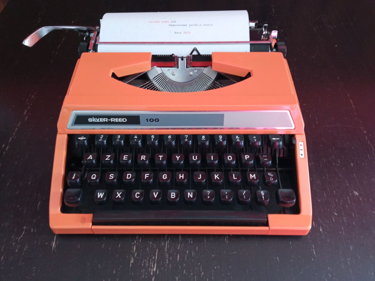 Comme neuve. Machine à écrire de marque silver-reed modèle 100. Son créateur est actuellement plus connu sous le nom commercial de seiko, géant de l'horlogerie japonais ce qui vous donne une idée de la qualité de fabrication de se produit. Elle est rarement dans un état aussi propre, dans les années 70', elle est superbe avec sa couleur métallique orange mandarine, avec son couvercle d'origine en plastique noir en parfait état. Elle est made in japan, très originale et chic (voir les photos). Cette machine est en excellent état de fonctionnement avec toutes les touches fonctionnelles et le chariot en parfait état, son clavier azerty français est très souple et très propre. C'est un très bon outil de travail mais aussi un objet de décoration vintage pour loft ou appartement très tendance et très original. Ruban noir opérationnel. Police d'écriture de mode script (voir les photos pour exemple d'écriture). Elle est très agréable au toucher.