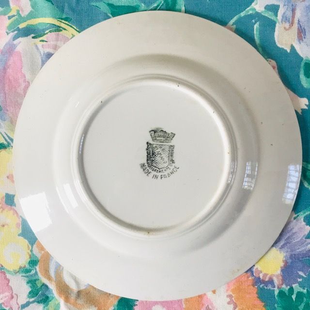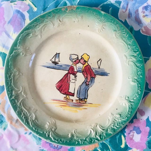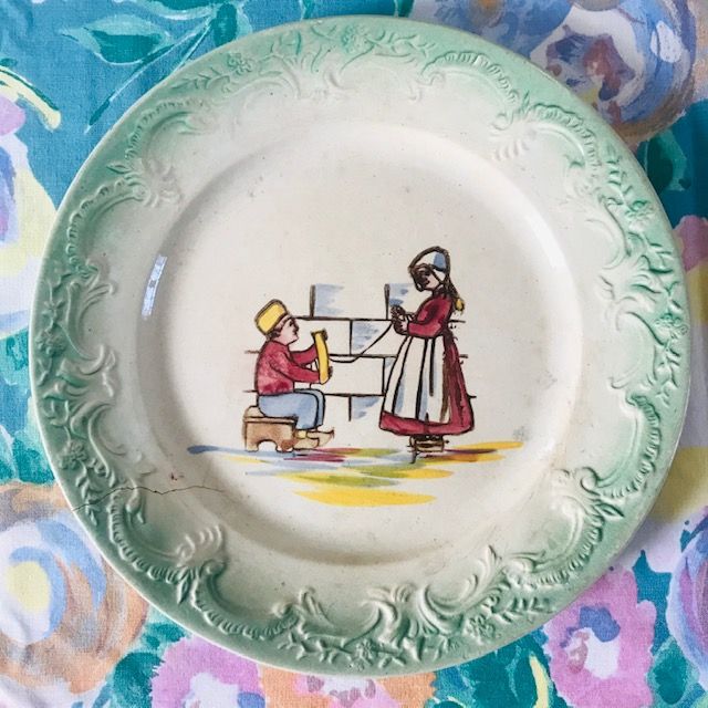 - j'ai rajouté la 4ème assiette signée, sur le même thème "garçon et fillette", nommée "déception" et qui provient de Saint-Amand. Elle a une frise bleue en relief avec un éclat sur le bord.