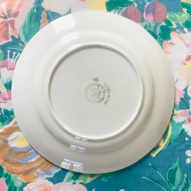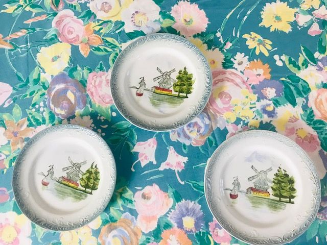 Début 20ème siècle. Elles sont quasi-identiques car les couleurs étaient rajoutées à la main sur un décor au tampon ou au pochoir. Elles ont une frise en relief et un bord bleu-gris.