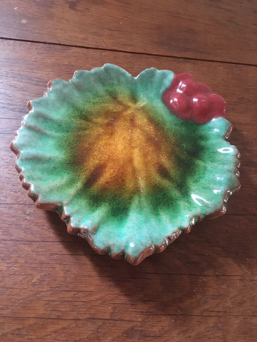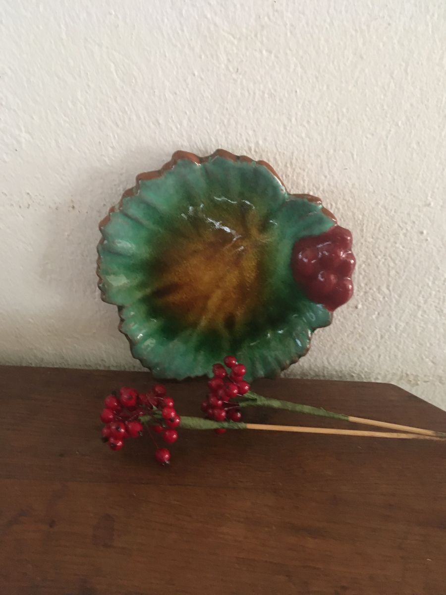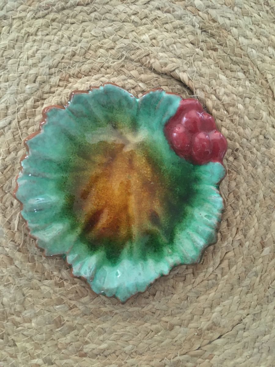 Vide poche en terre cuite à la forme de feuille de vigne vernissée.Pièce unique artisanale très décorative.20 x 19 x 2 cm.