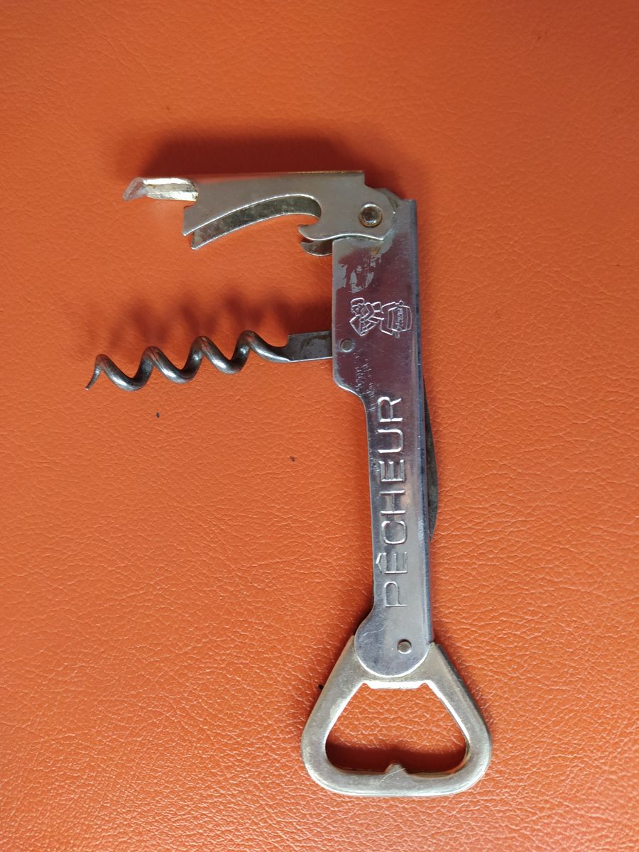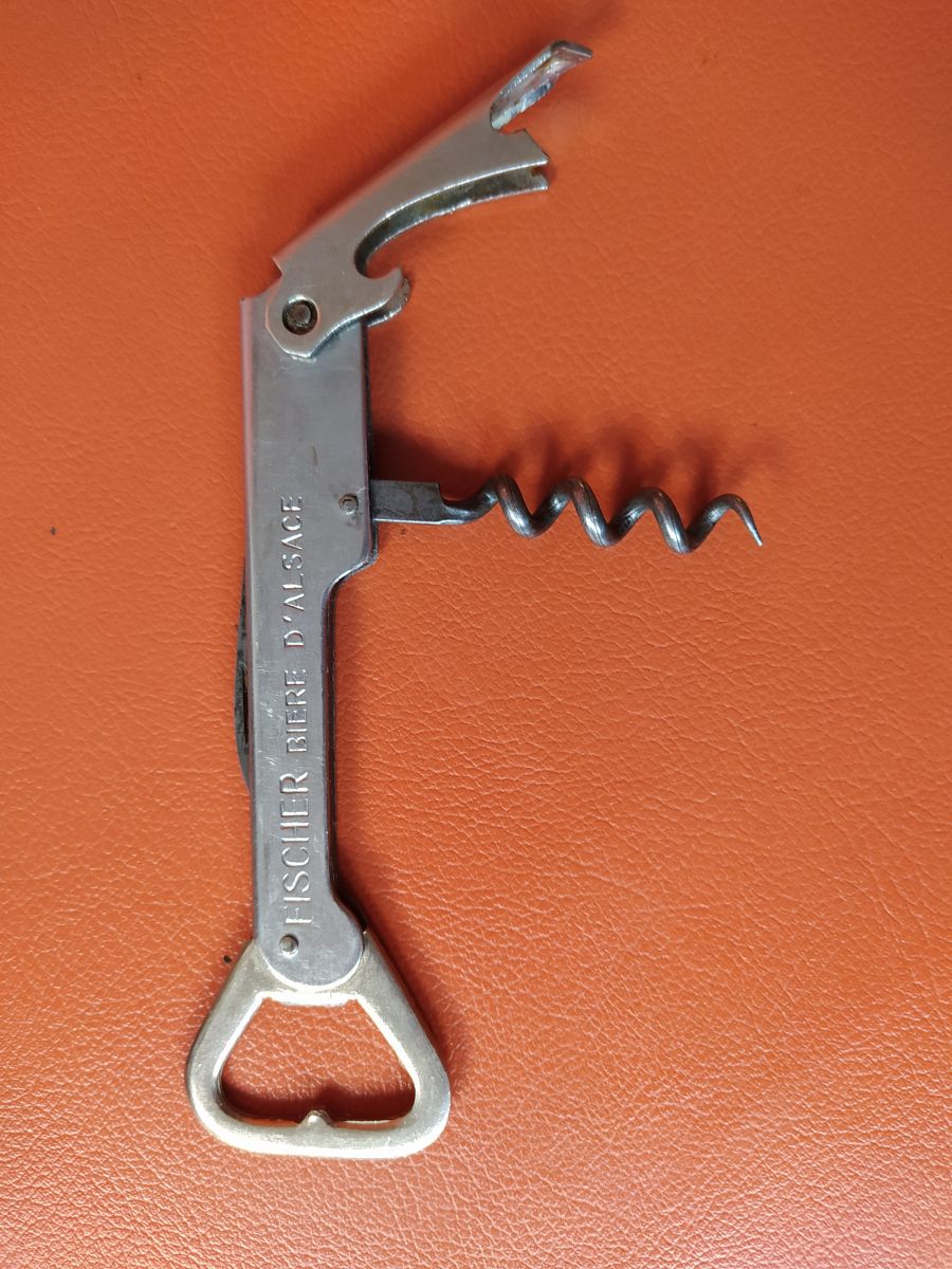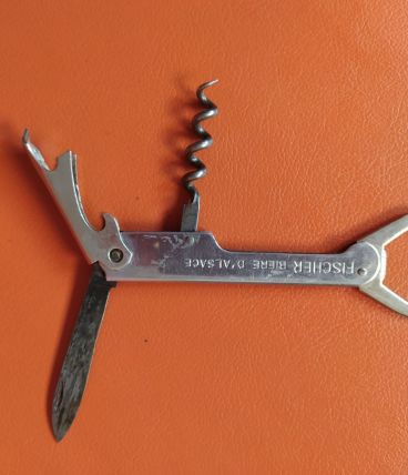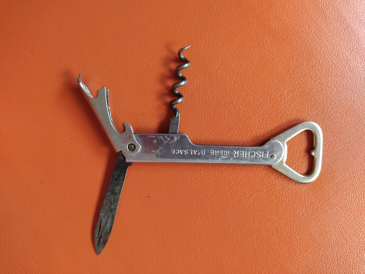 Authentique limonadier d'Alsace, territoire des bières, avec couteau, tire-bouchon et deux décapsuleurs.