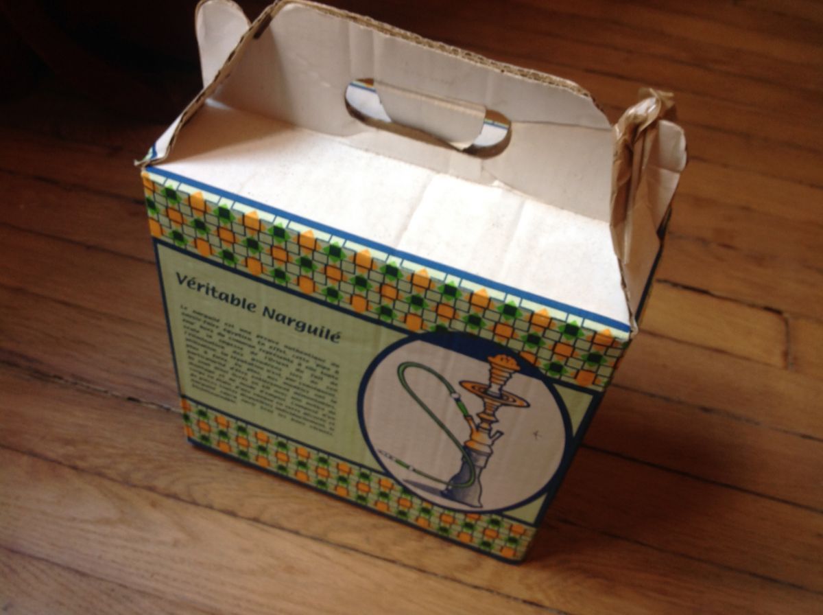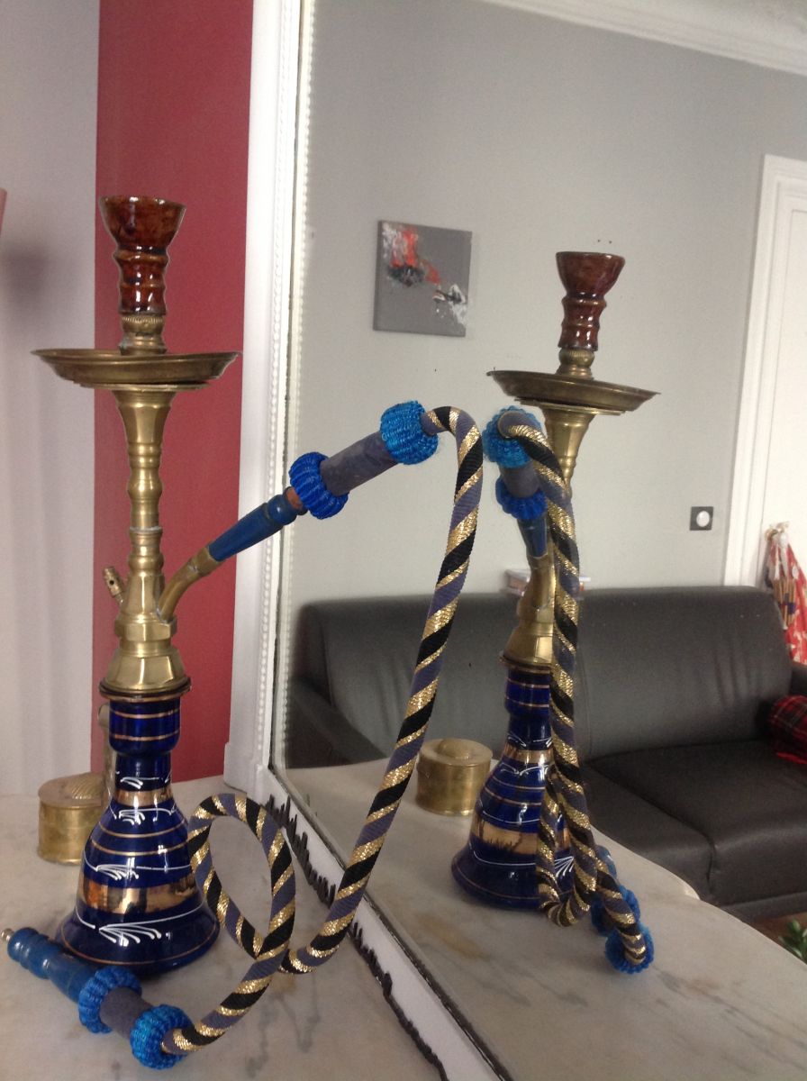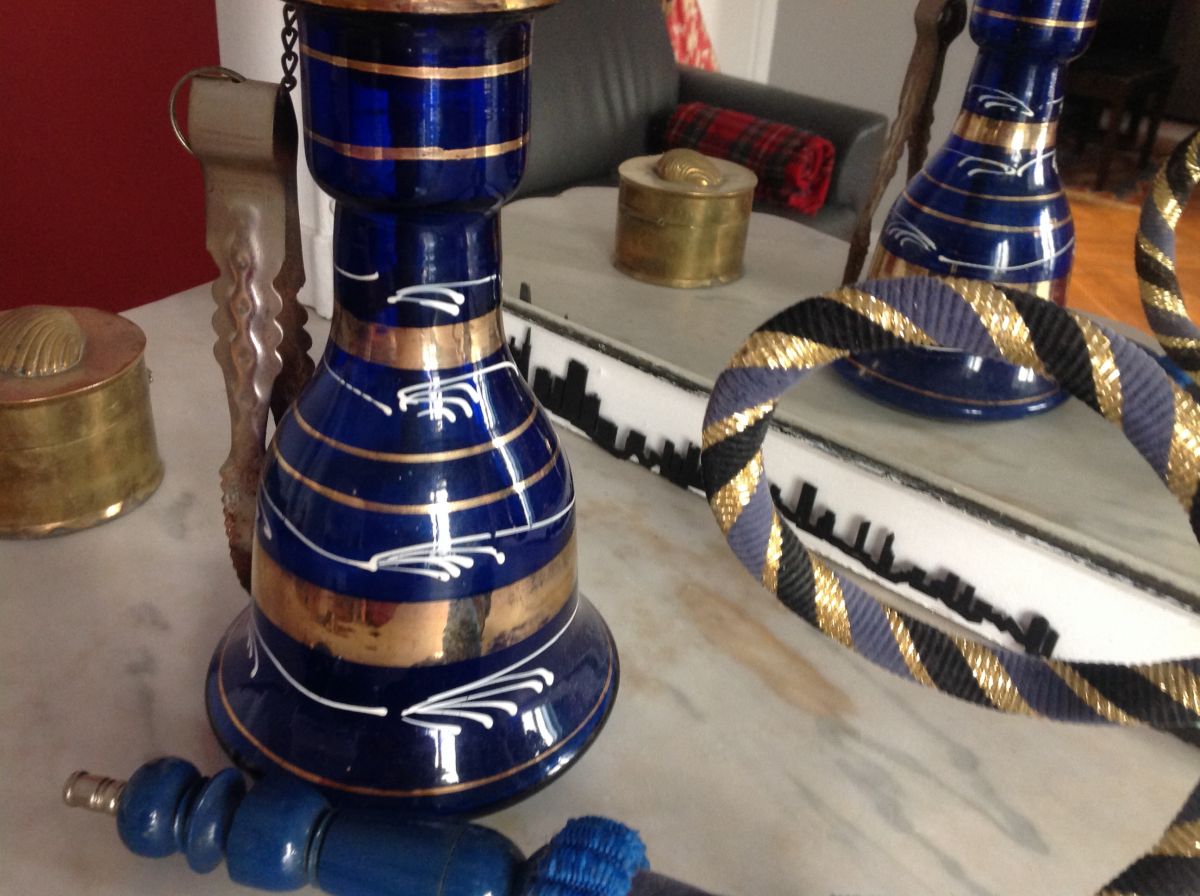 Narguilé égyptien avec motifs bleus et dorés, en verre et laiton principalement.