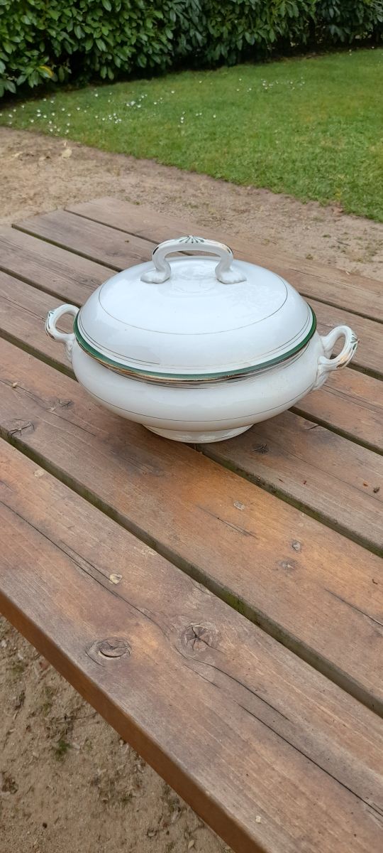 Aucune trace d'éclat ni d'ébréchure. Le liseré doré est par endroit légèrement estompée mais rappelons que cette dame est presque centenaire ! Dimensions: hauteur 22 cm de la base jusqu'à la poignée du couvercle. Diam: 22 cm à l'ouverture. Largeur: 32 cm y compris les anses. Poids: 2, 2 kg (le colis final avoisinera les 3 kg).