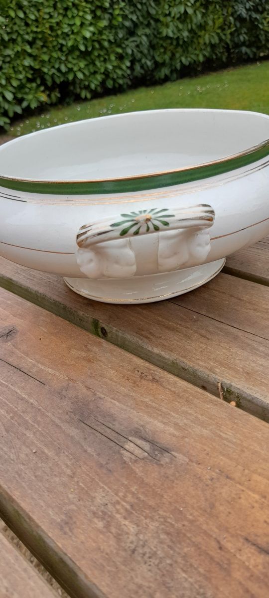 Très jolie, forme arrondie, élégante et sobre avec ses liserés dorés et verts et un petit motif de fleurs peint main sur chaque anse, elle peut servir de saladier, de coupe de fruits, ou même de jardinière à fleurs printanières.
