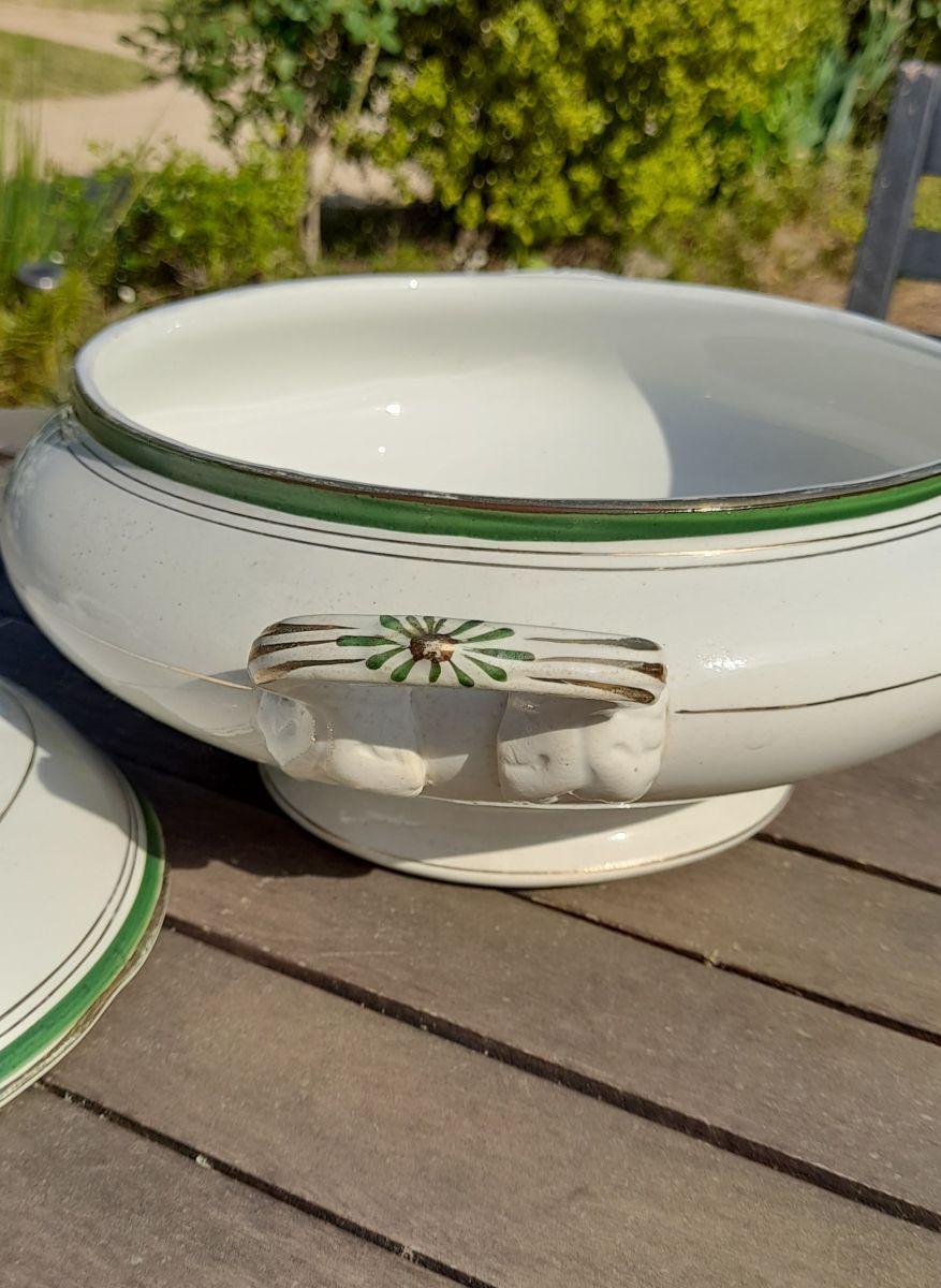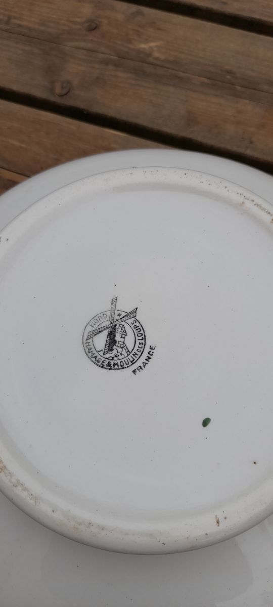 Soupière du début xxème (les marques de la faïence de saint-amand, orchies, moulin-des-loups et hamage ont évolué en fonction des création et des fusions des manufactures. Cette signature aux deux moulins permet de situer la production dès 1923. Les points d'oxydes ferriques sur la faïence(cf photos) permettent également de confirmer une confection datant du début du XXeme.